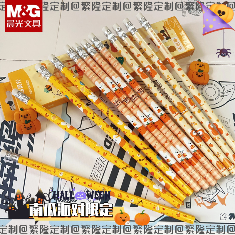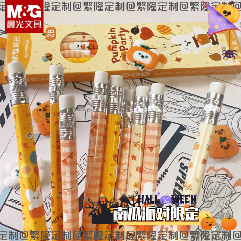 晨光木杆铅笔新款限定南瓜派对HB六角学生高颜值ins带橡皮头308E8
