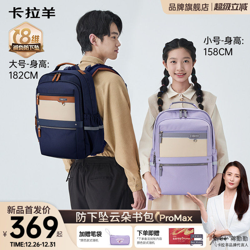 卡拉羊中学生书包云朵ProMax减负护脊超轻大容量双肩包男孩女生背包初中生书包小学生书包旗舰店官方正品