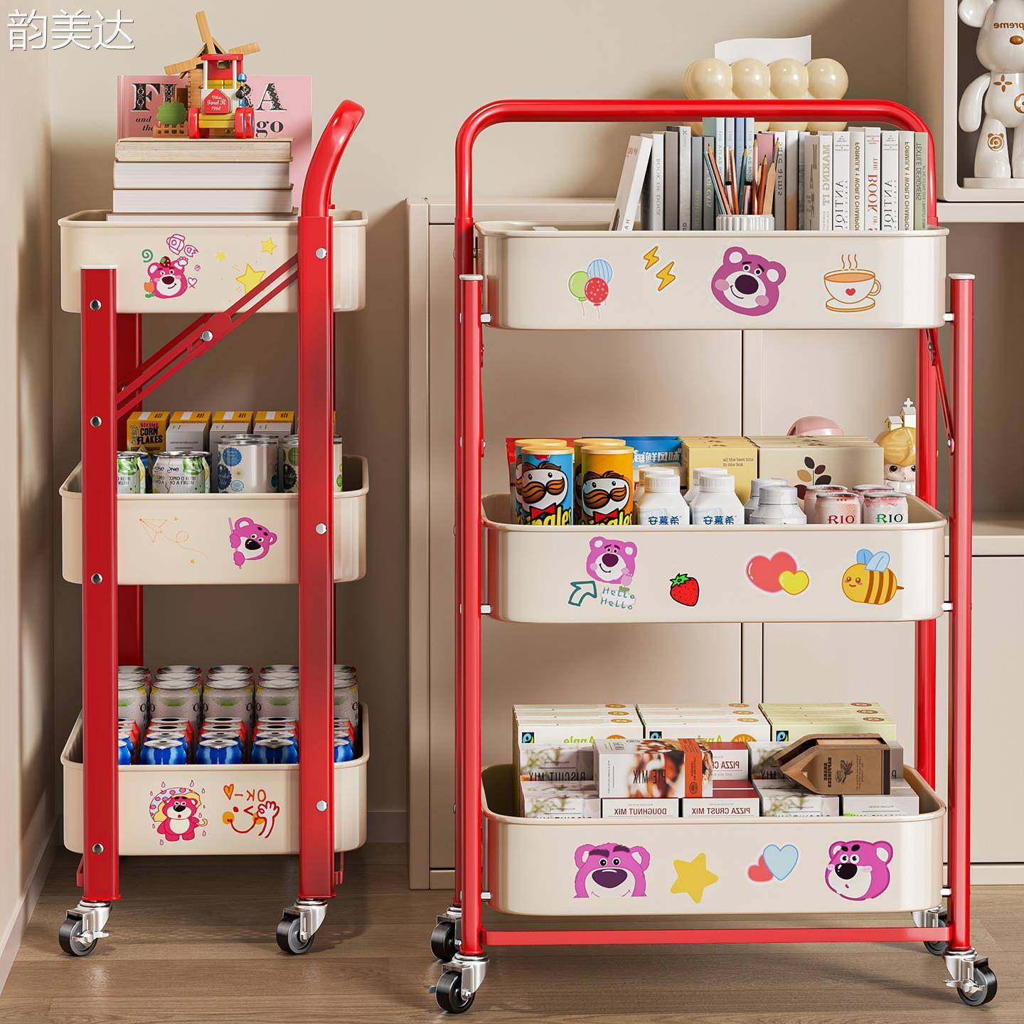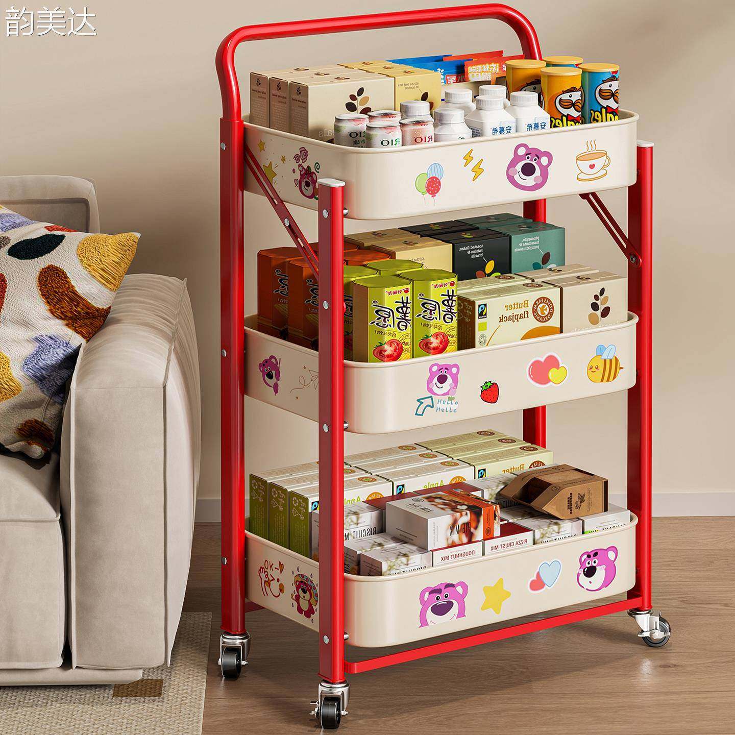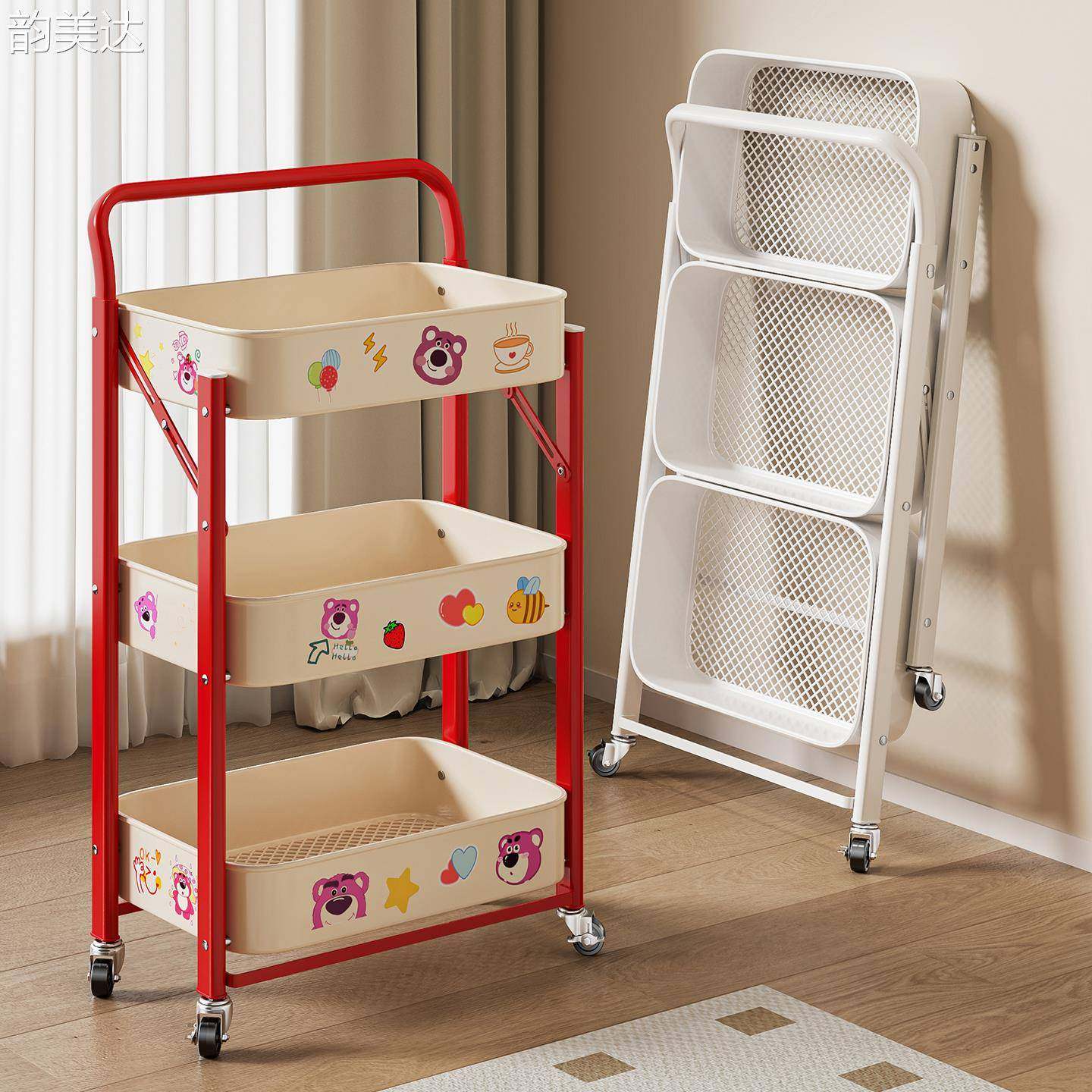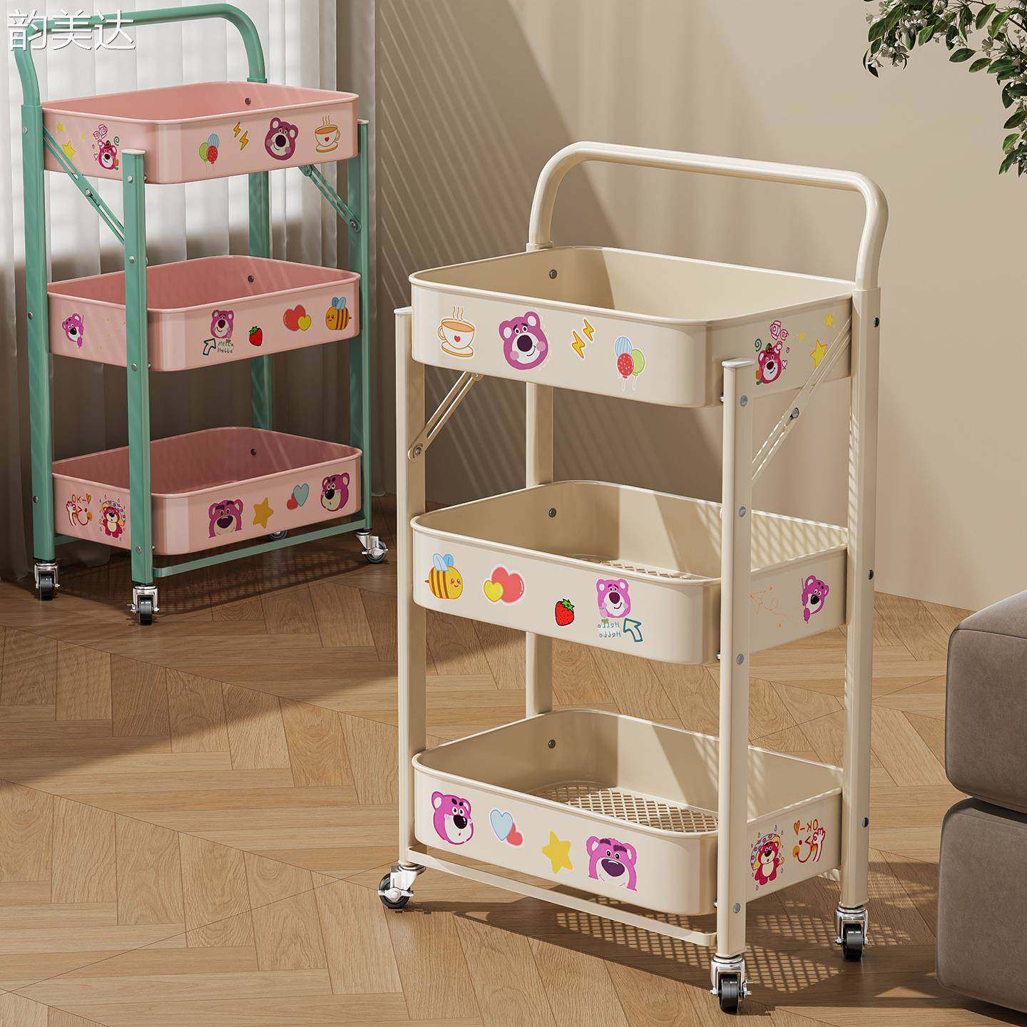 韵美达小推车置物架厨房落地多层卧室零食移动可折叠儿童玩具收纳书本架
