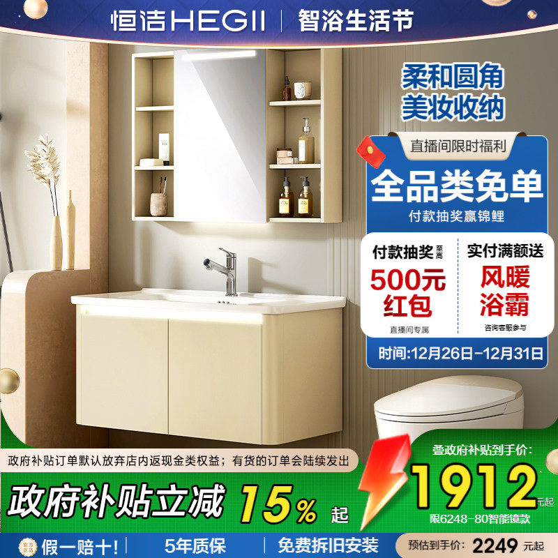 恒洁卫浴现代奶油风浴室柜组合卫生间岩板洗漱台陶瓷一体洗手盆