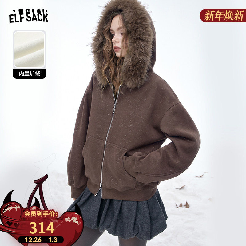 妖精的口袋复古大毛领撒银连帽卫衣开衫外套女2025冬新款加绒上衣