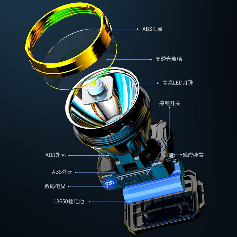 LED头灯超亮可充电头戴式强光感应特亮手电筒小型便携式夜钓鱼灯