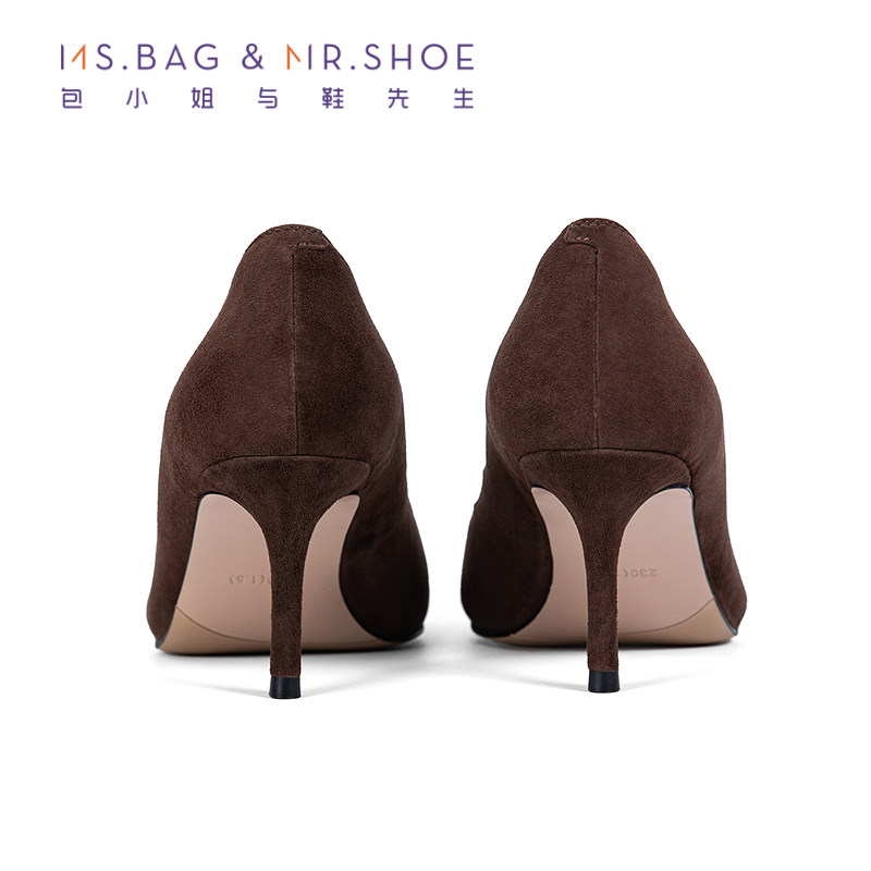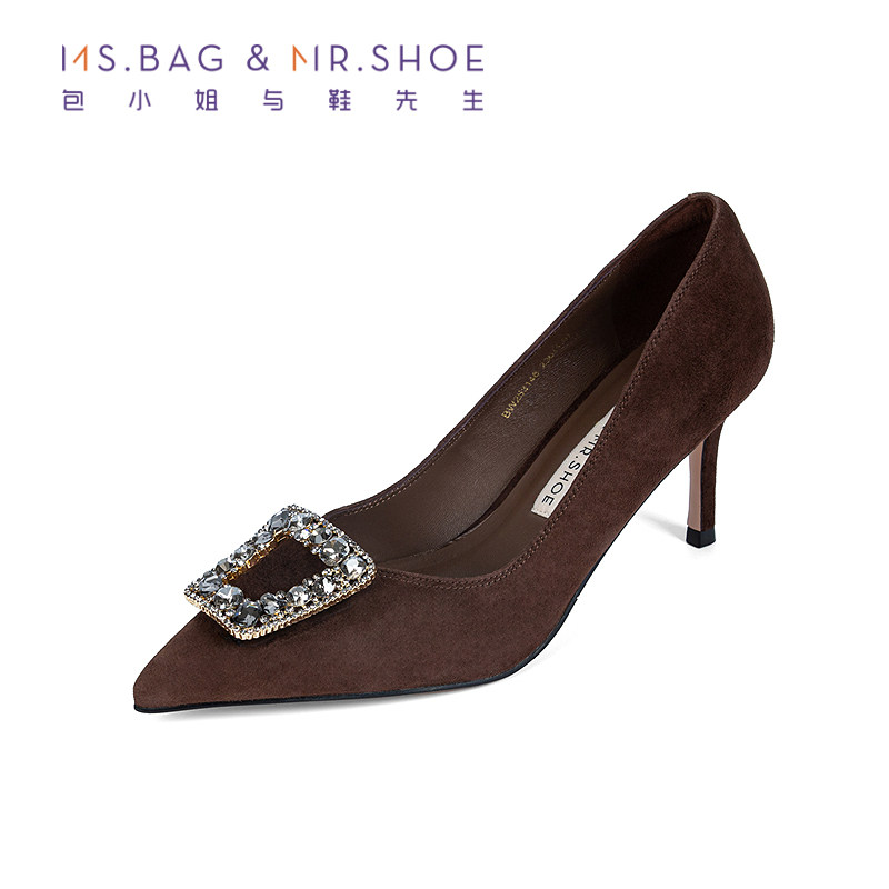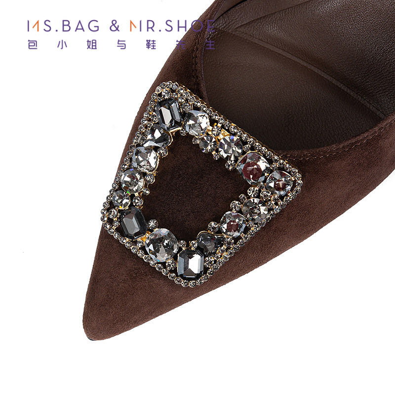 包小姐与鞋先生2025年秋季新款羊反绒方钻扣细跟浅口单鞋女253146