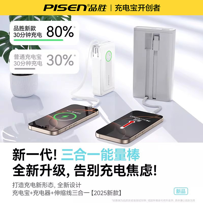 【充电宝3C认可上飞机】品胜2026新款三合一35W自带伸缩线插头快充小巧便携10000毫安适用苹果17小米移动电源