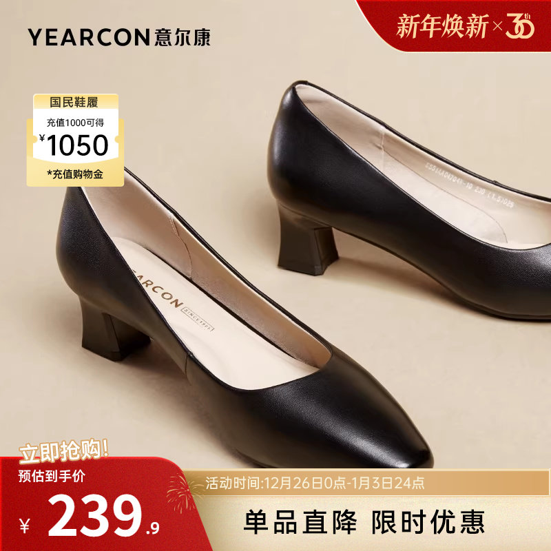 意尔康女鞋春秋季单鞋女士真皮尖头粗跟皮鞋通勤工作鞋气质