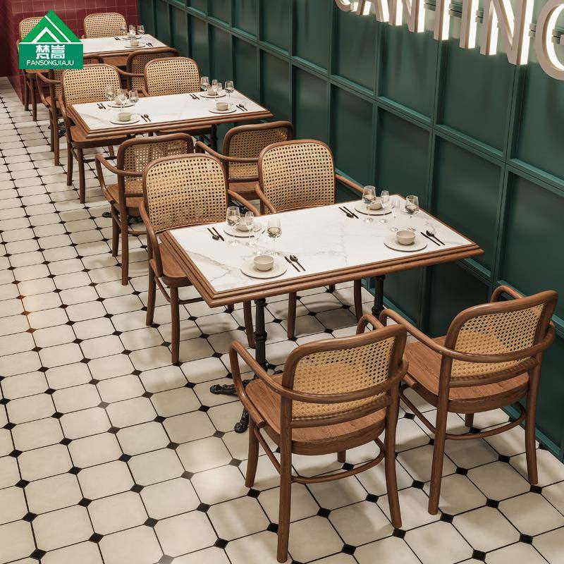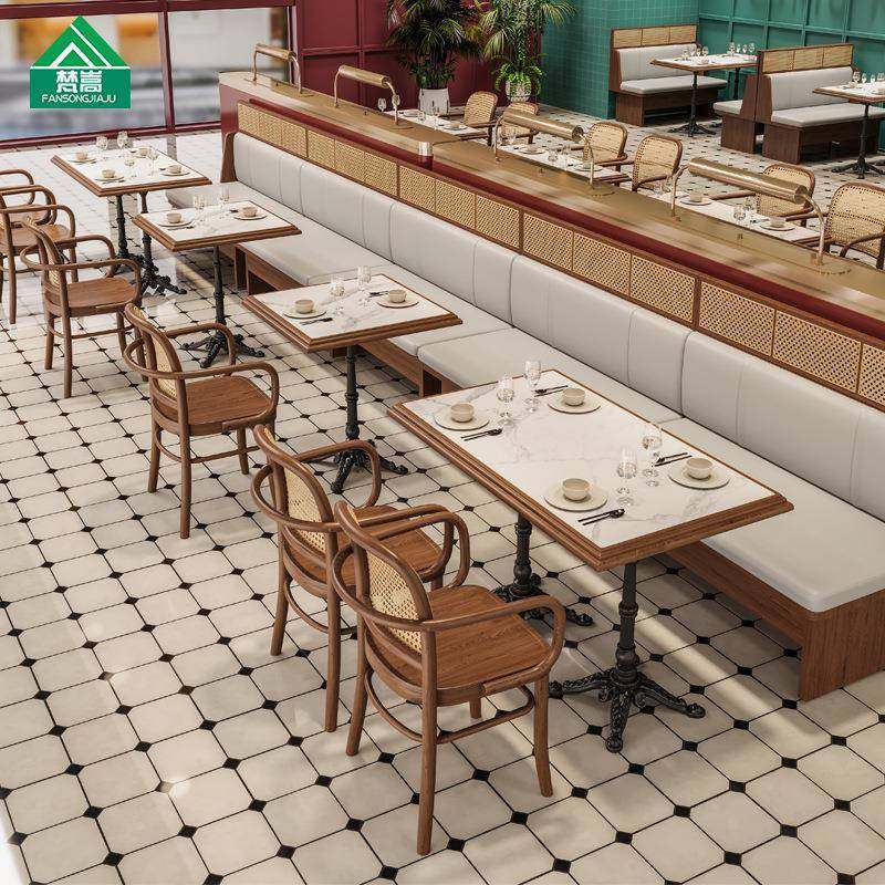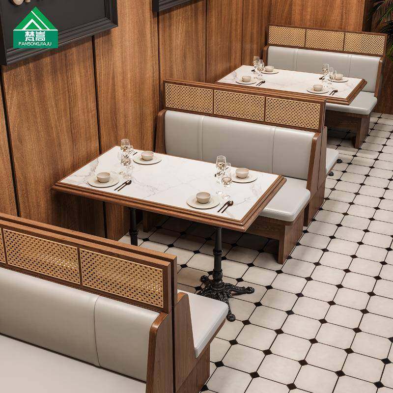 主题餐厅西餐厅靠墙卡座沙发茶餐厅轻食店实木藤编餐桌椅组合商用