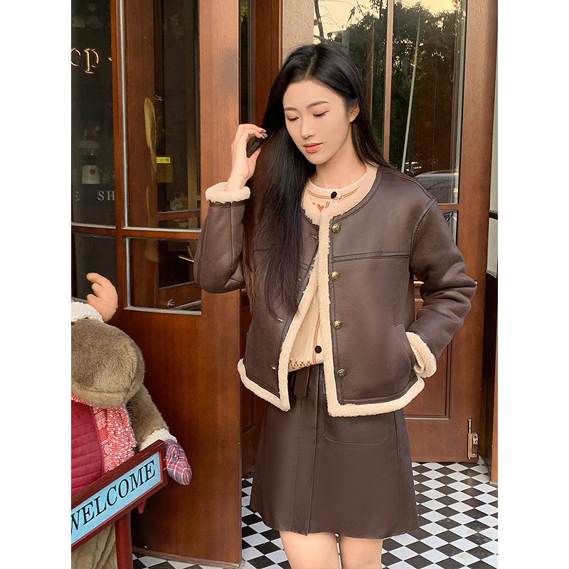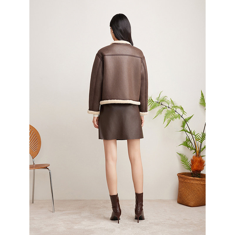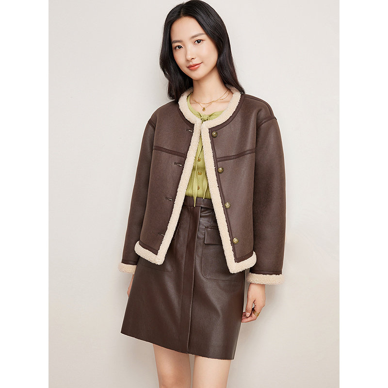 Goodland美地女装冬季时尚美拉德短款圆领环保羊毛皮草外套