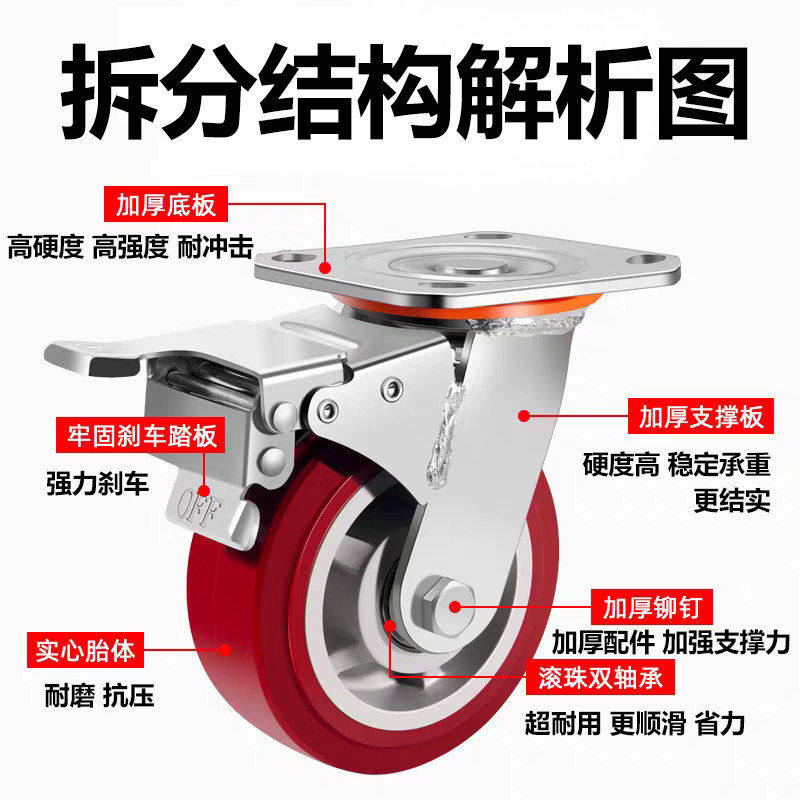 万向轮轮子重型聚氨酯静音脚轮6寸推车板车轮子拖车滑轮承重轱辘