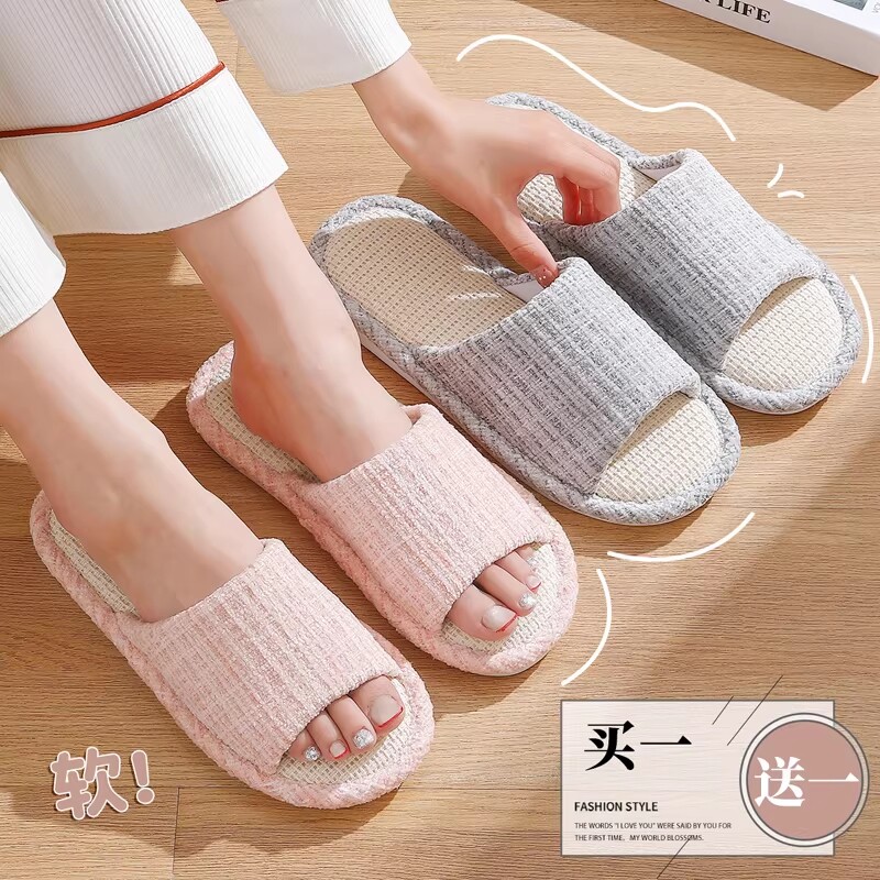 买1送1亚麻拖鞋女士情侣家居一对静音防滑家用招待客人棉麻拖鞋男