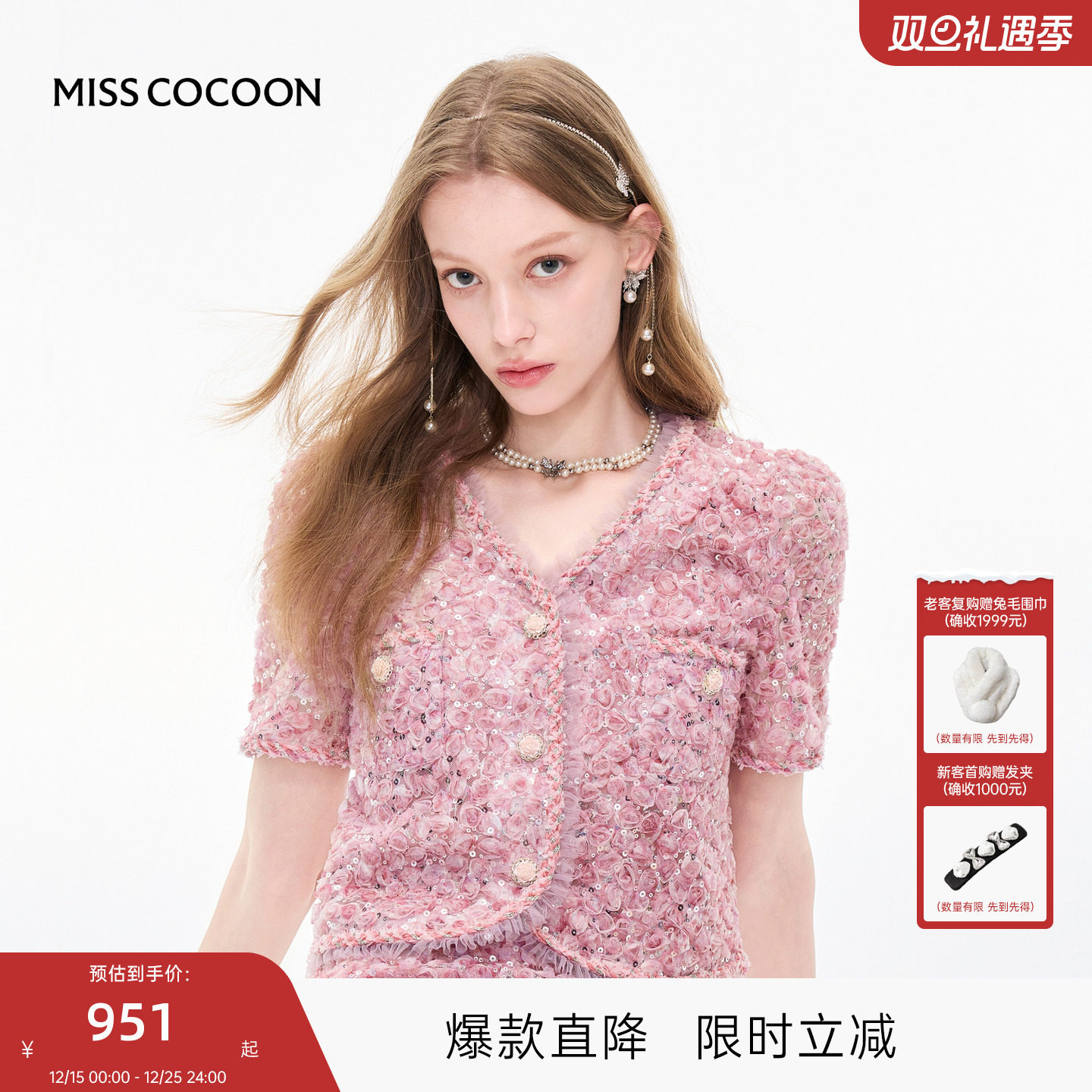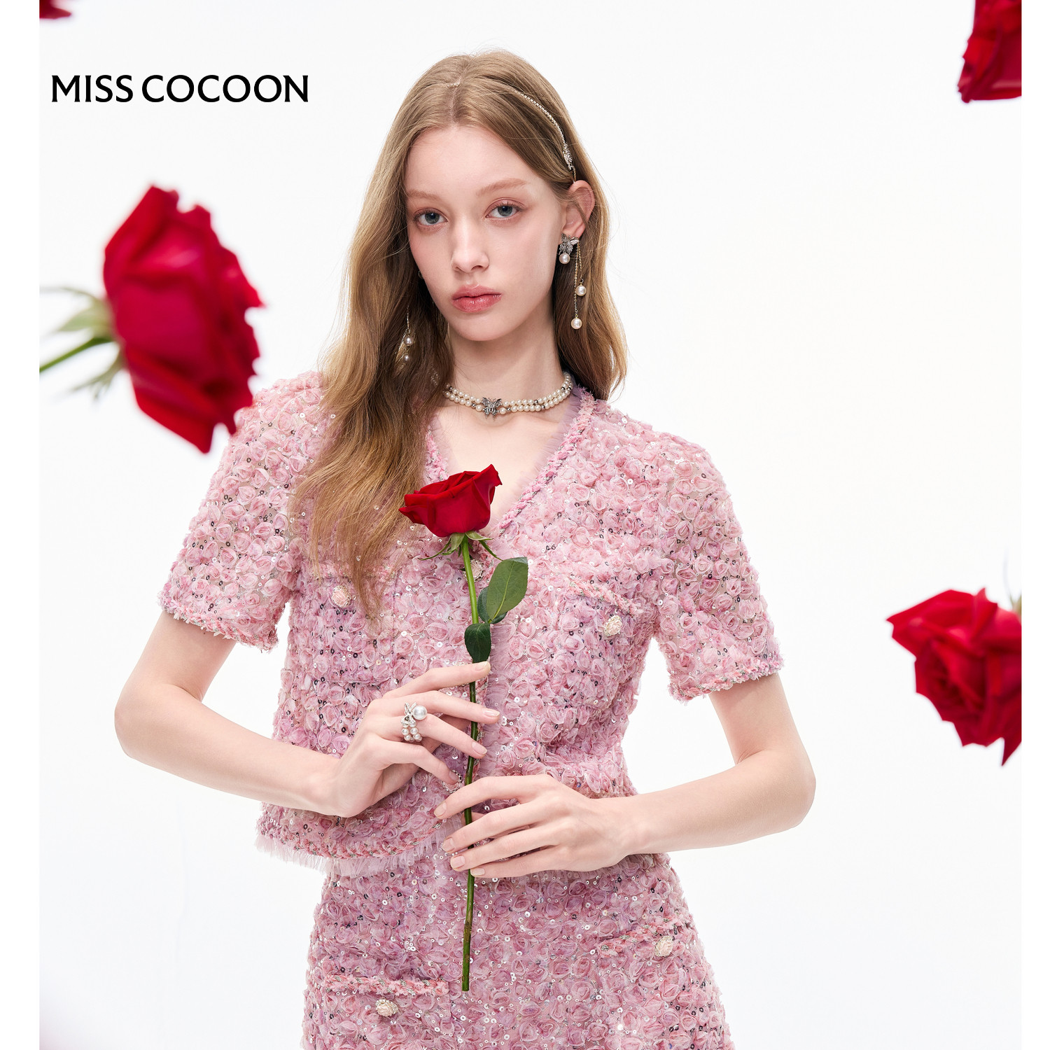 MISSCOCOON可可尼短袖两件套2025秋新款小香风立体玫瑰短裙套装女