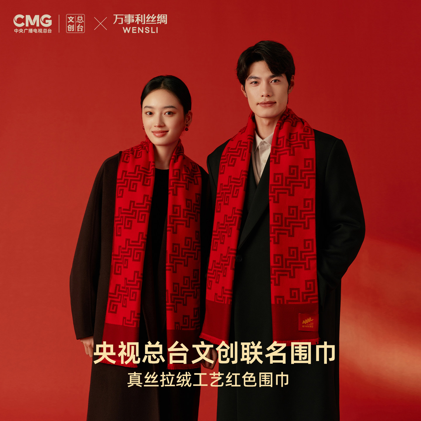 万事利×总台文创联名真丝绒围巾红色本命年礼物男女款骐骥驰骋