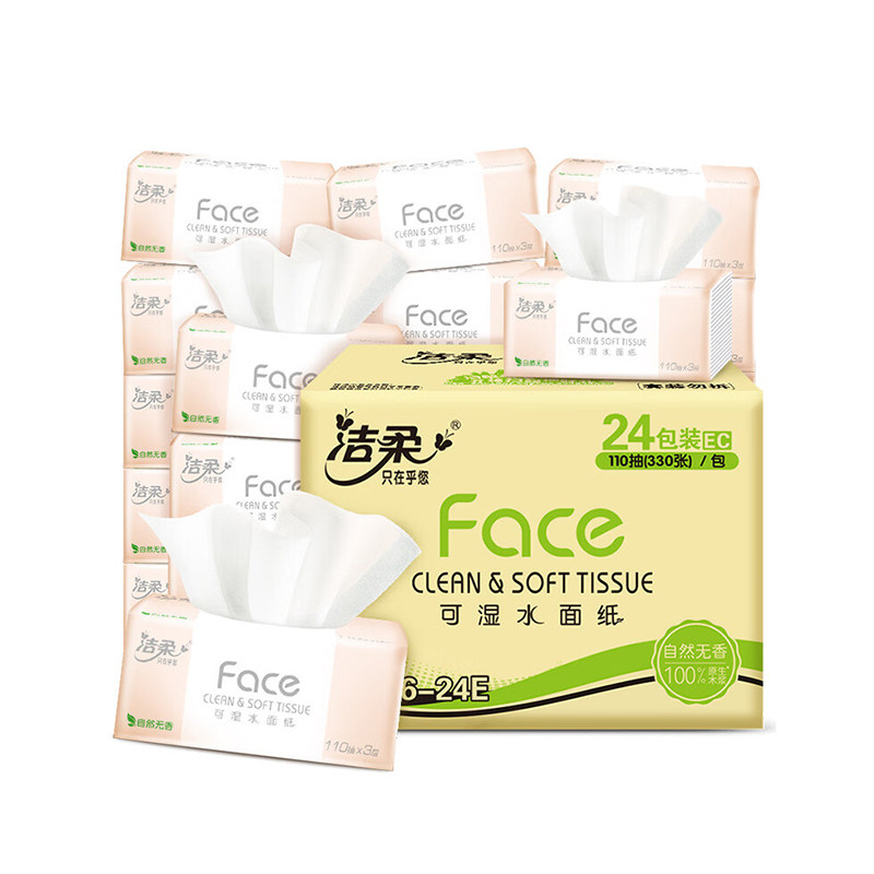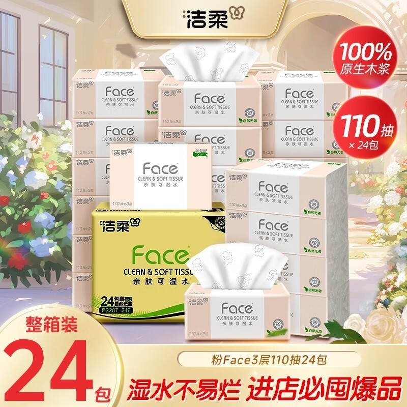 洁柔抽纸粉Face自然无香110抽24包箱装家用实惠餐巾纸面巾纸原生