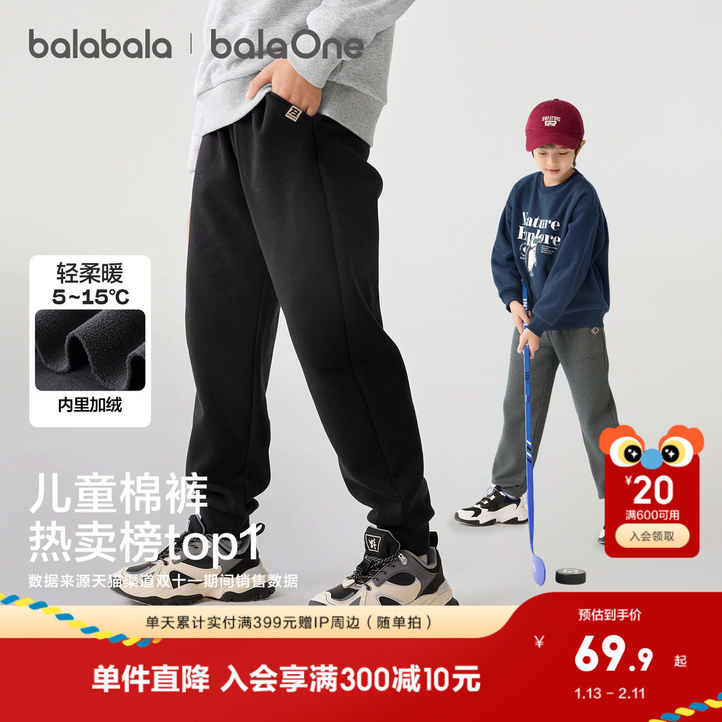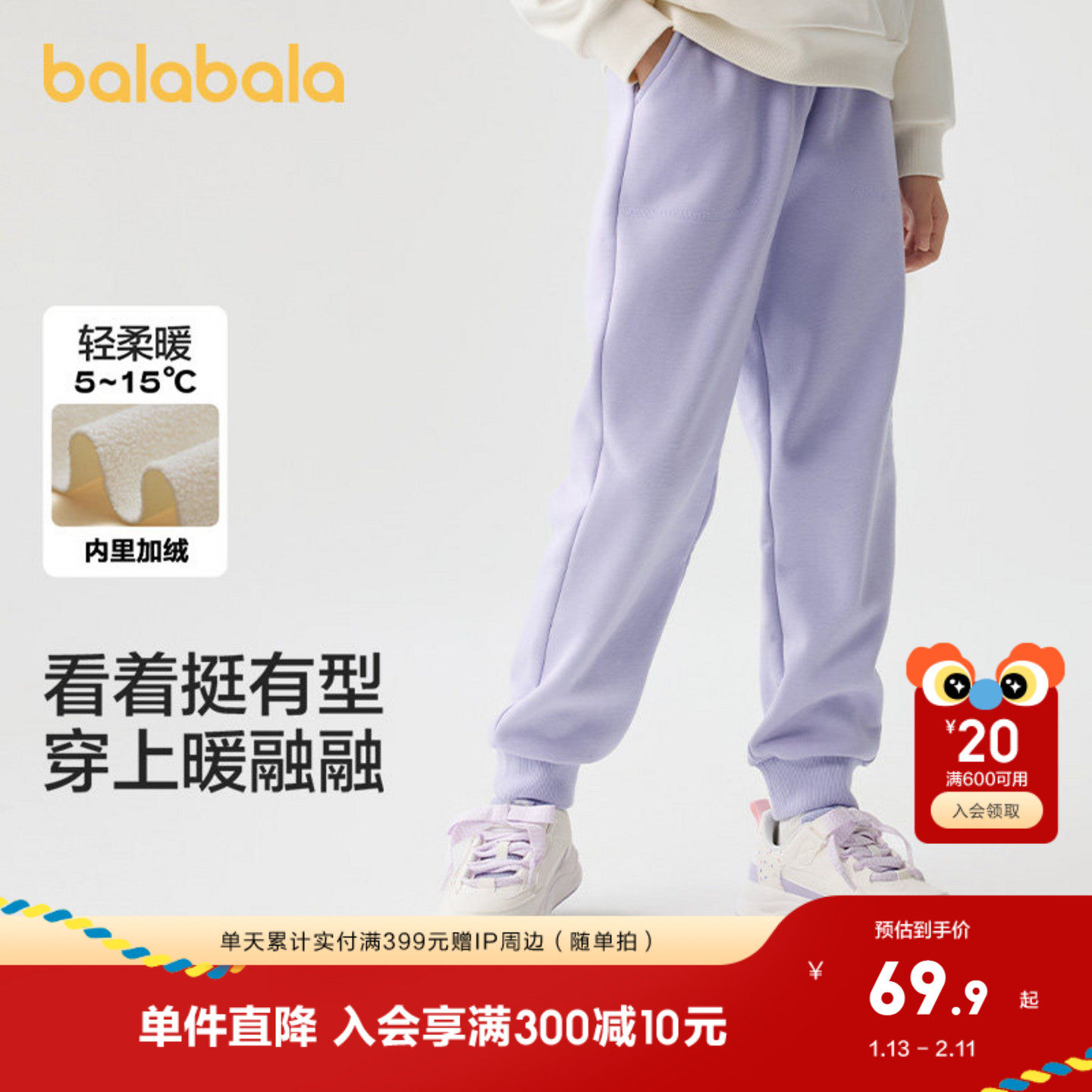 裤侧织唛点缀;摇粒绒面料