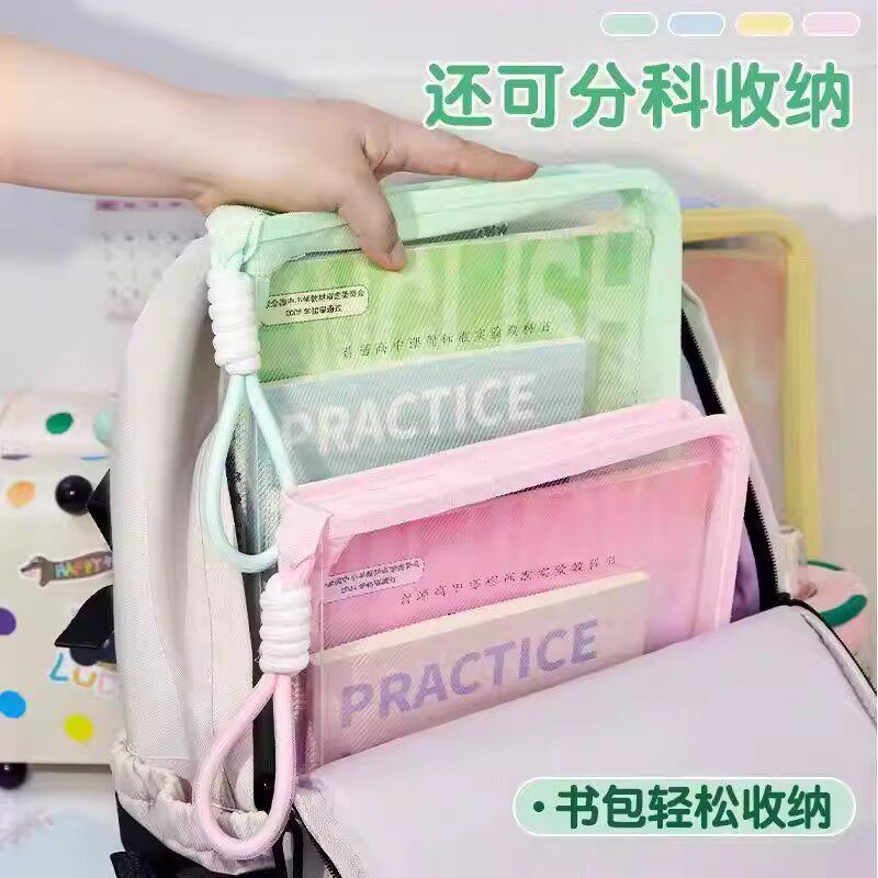 L型学科目分类袋透明网纱文件袋拉链大开口学生手提拎书袋考试用