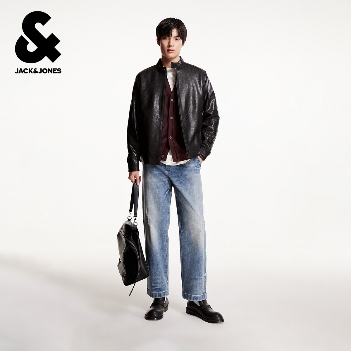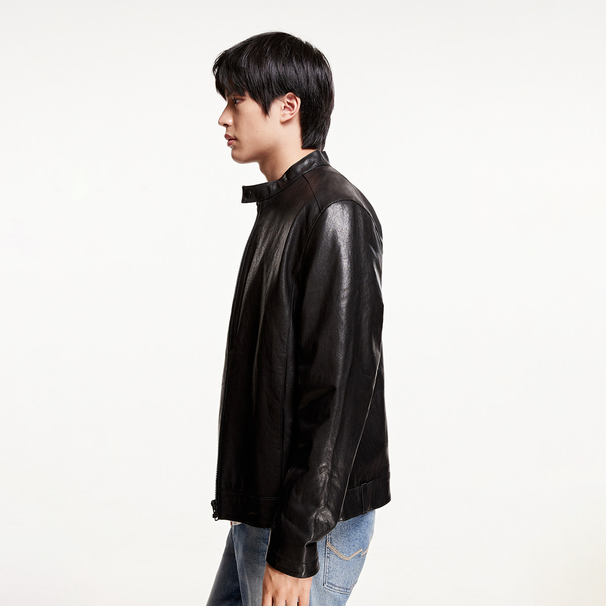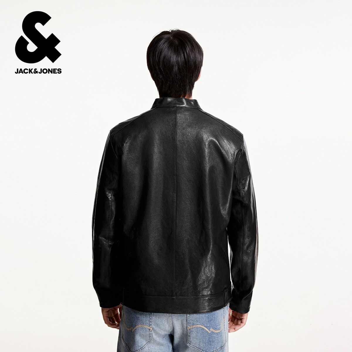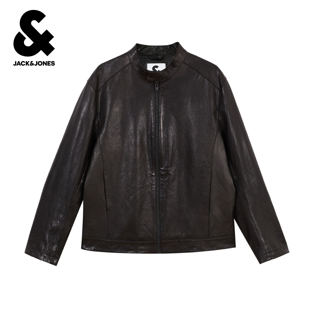 杰克琼斯春季款男装时尚机车风羊皮夹克外套立领纯色直筒拉链上衣