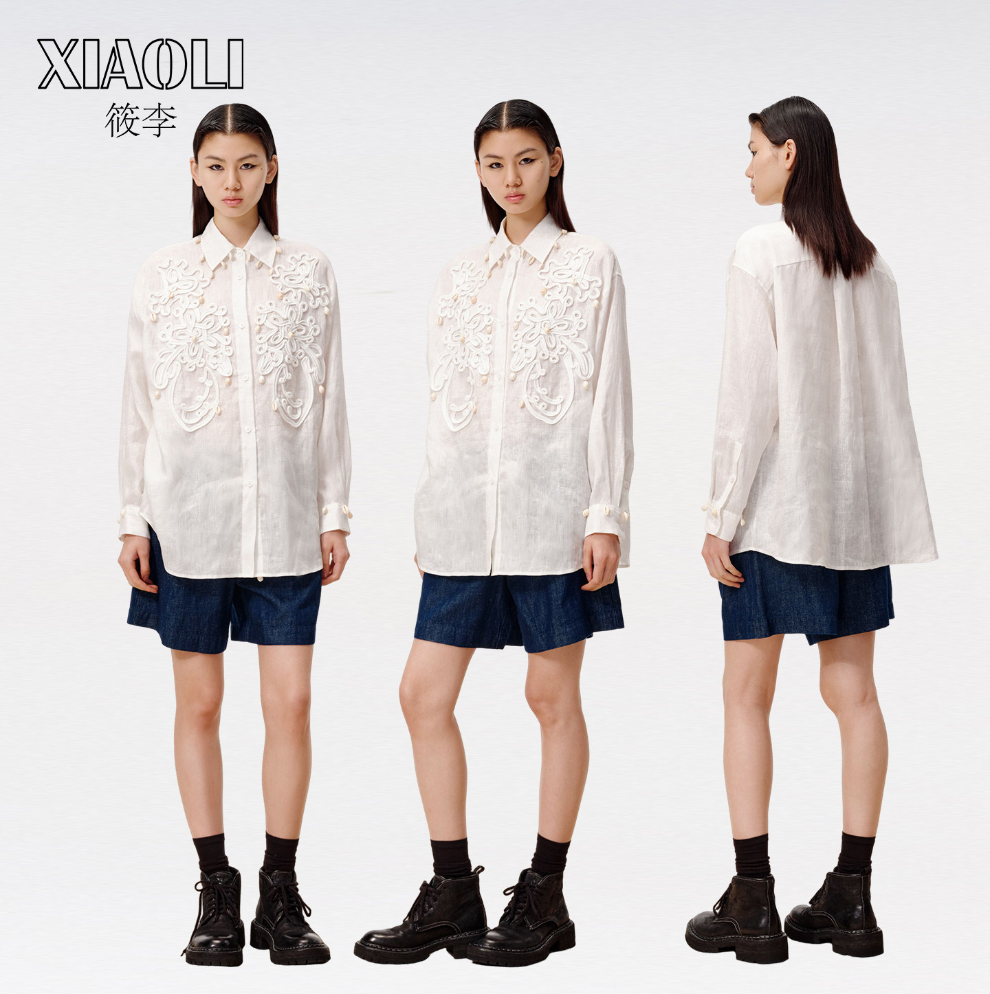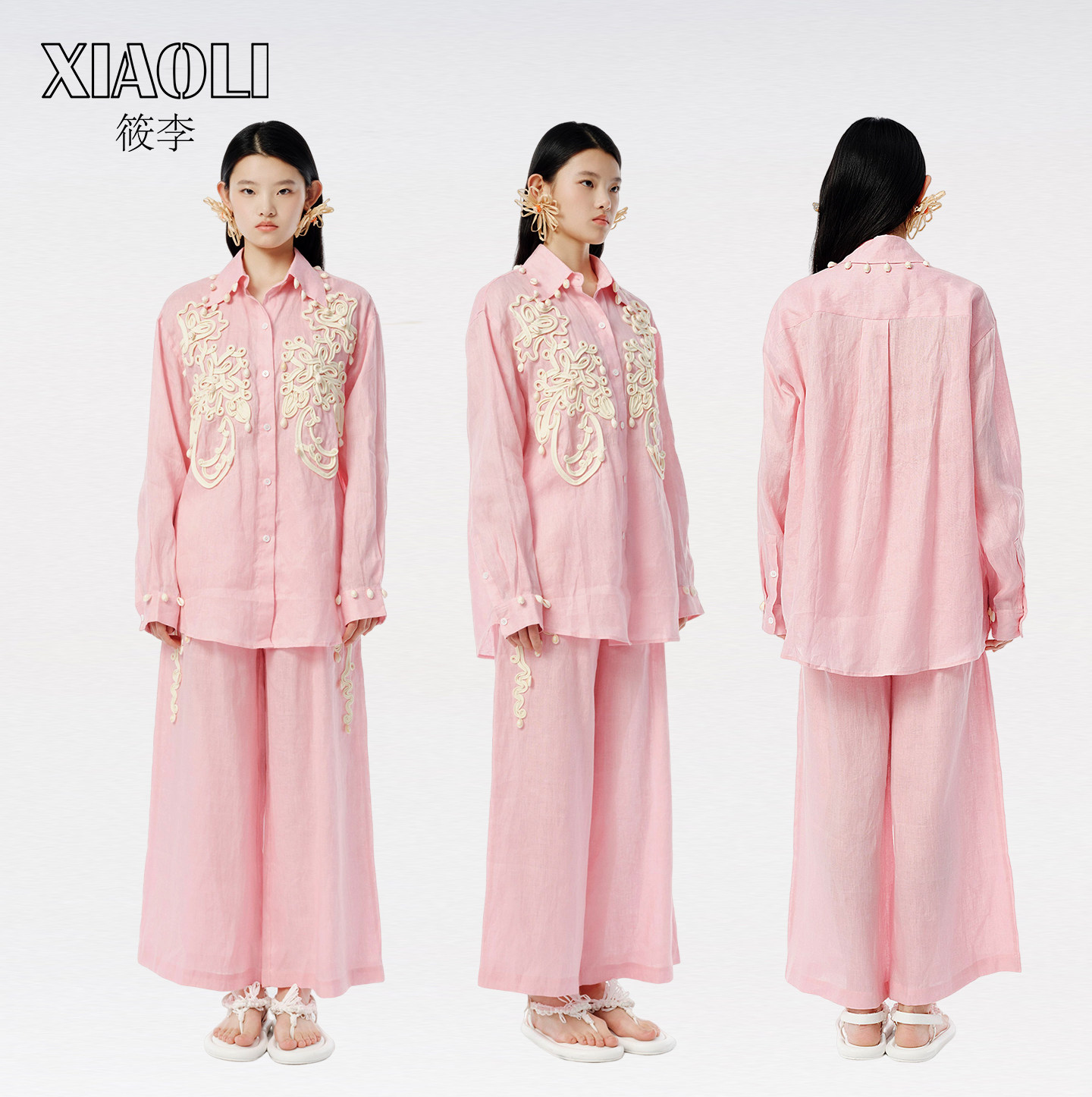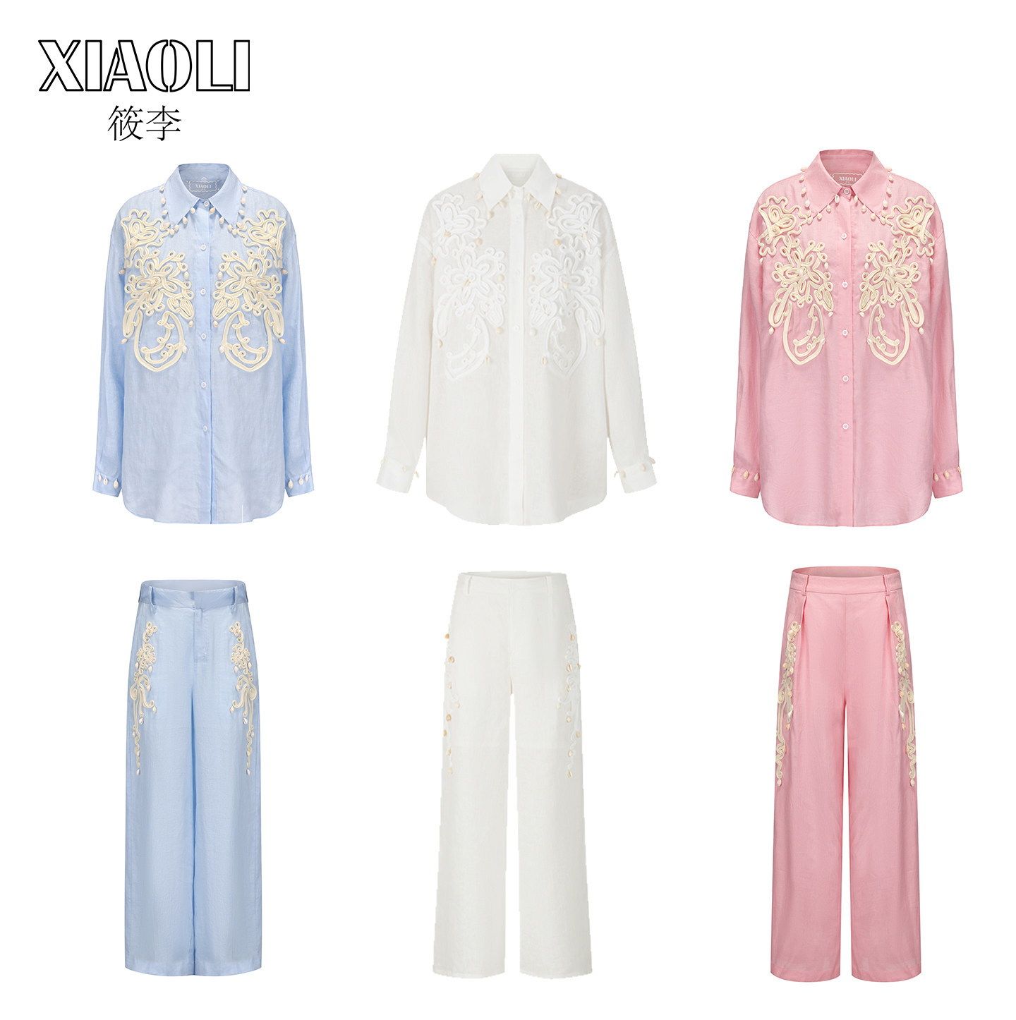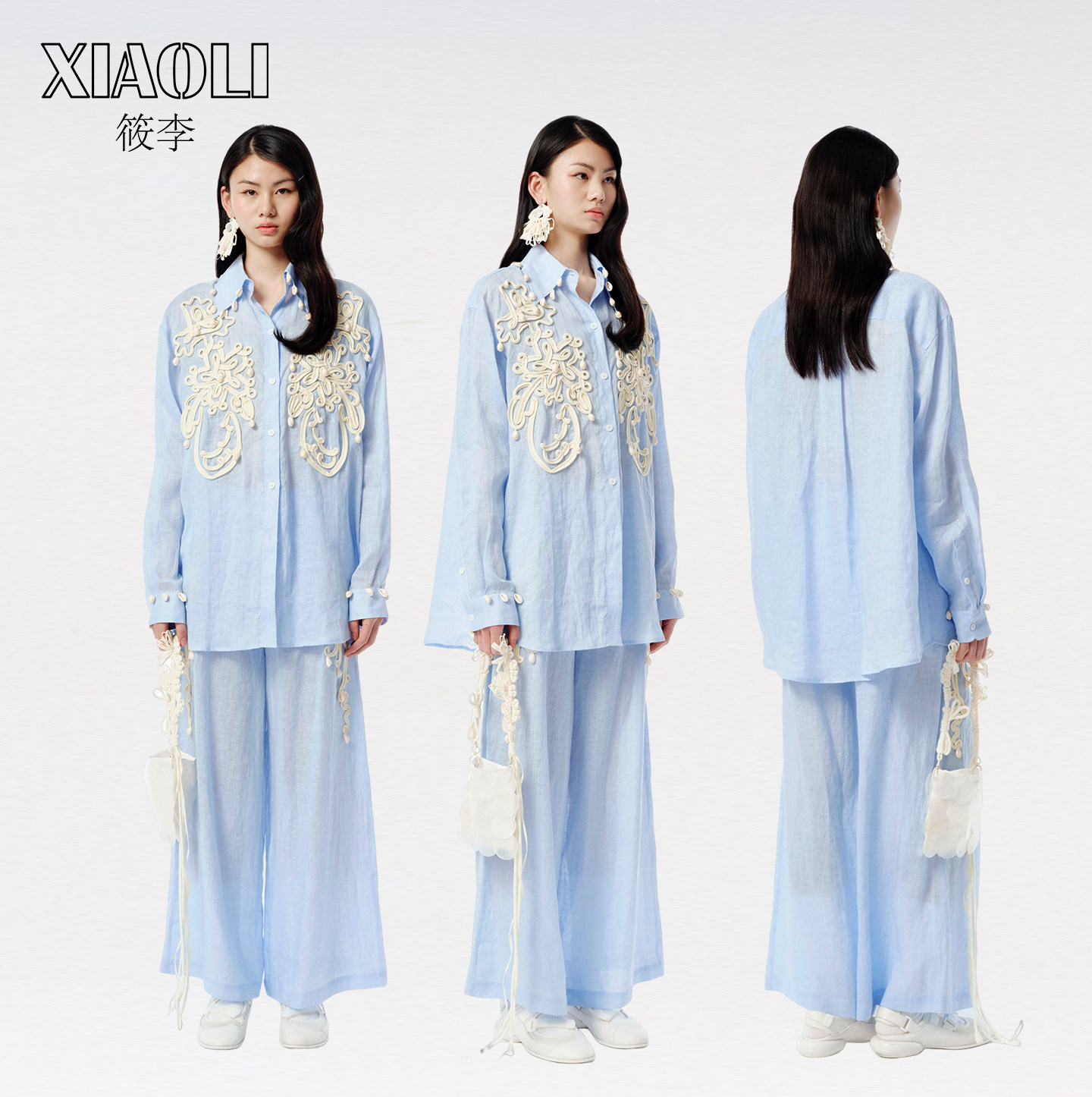 【丁程鑫同款】XIAOLI筱李25春夏绳盘绣海螺装饰亚麻长袖衬衫蓝色