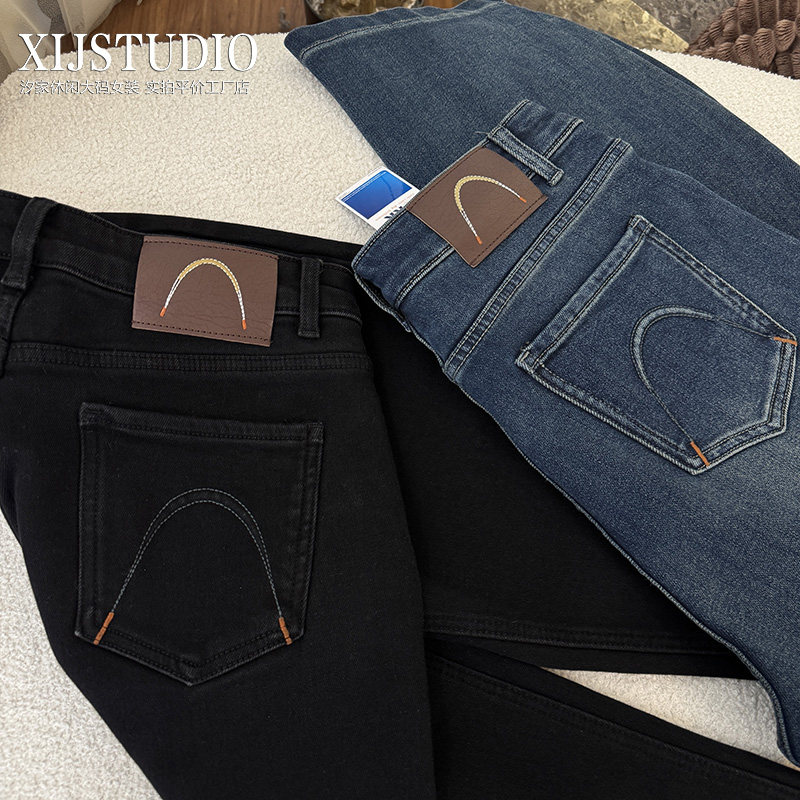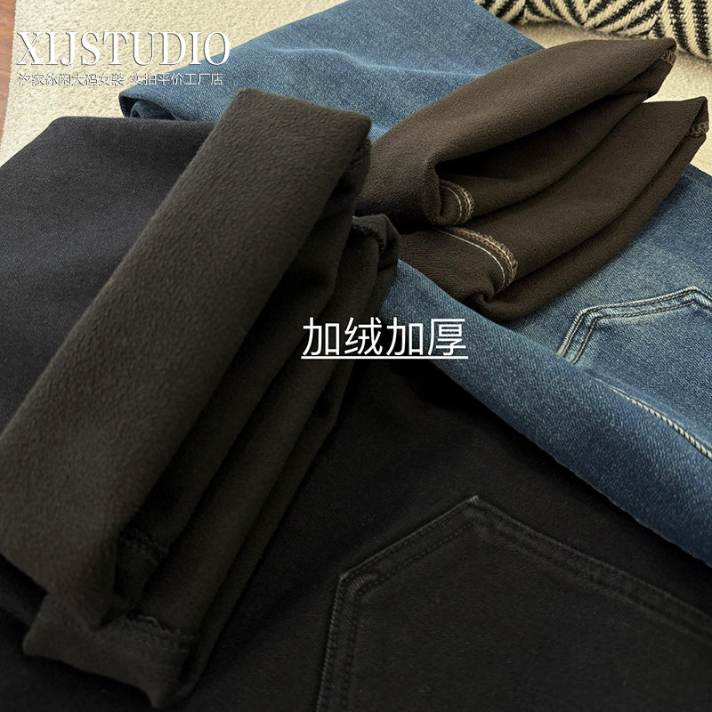 汐家女裤 大码女装厚款加绒秋季牛仔裤弹力休闲窄版小直筒裤