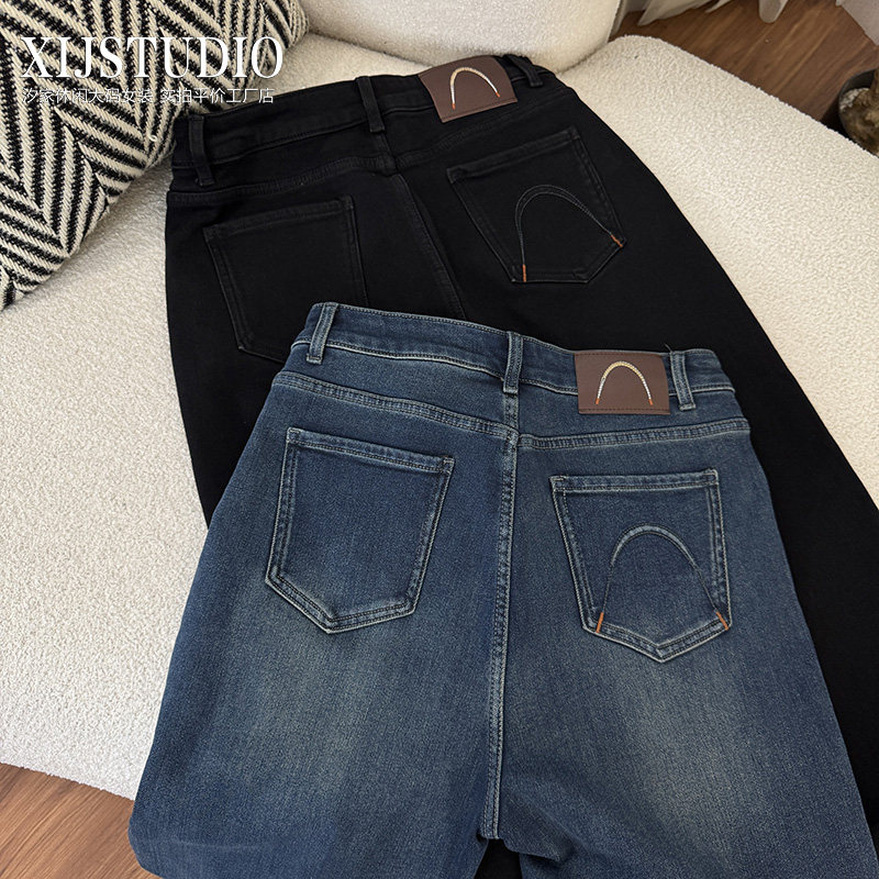 汐家女裤 秋冬高品质加绒高腰直筒牛仔裤大码简约百搭奶奶裤长裤