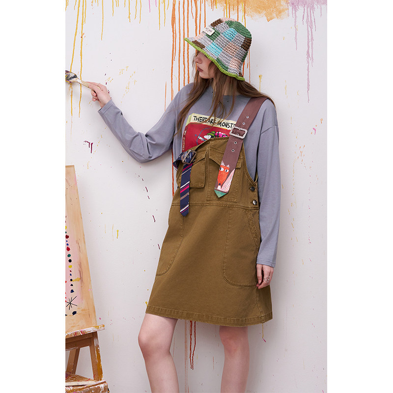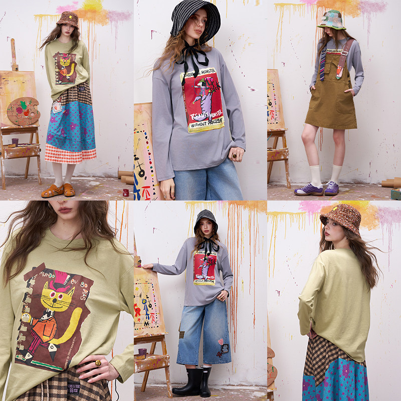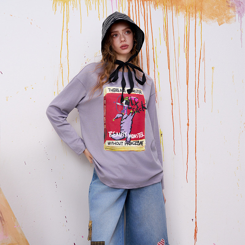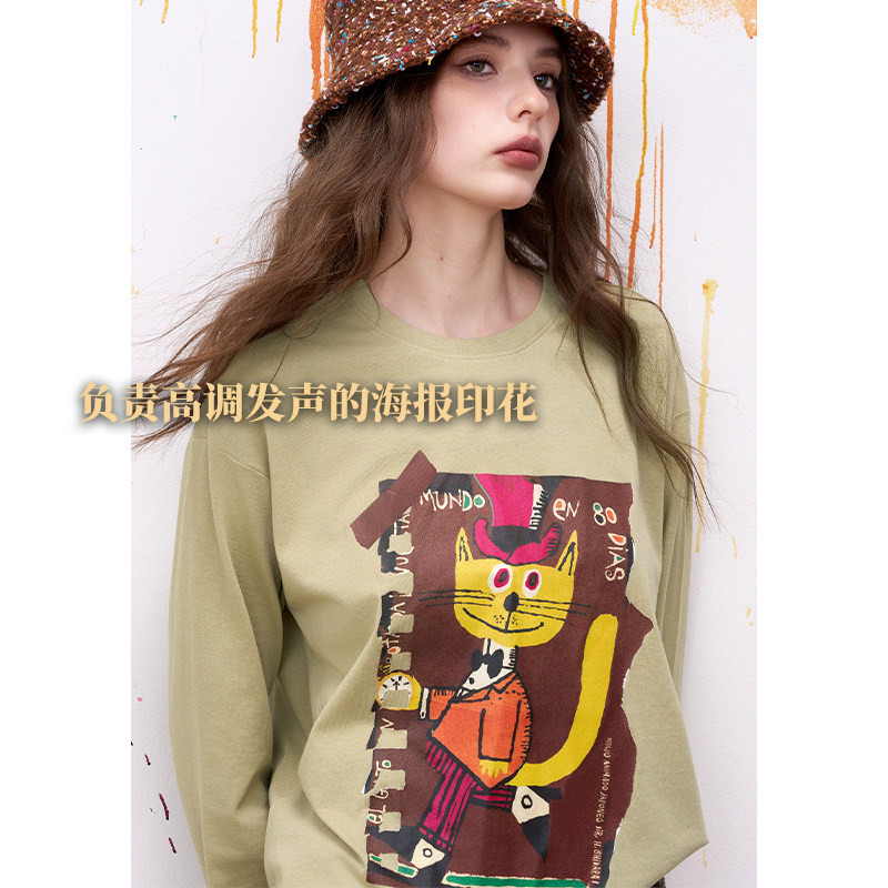 妖精的口袋复古印花长袖t恤女2026年夏季新款宽松设计感小众上衣