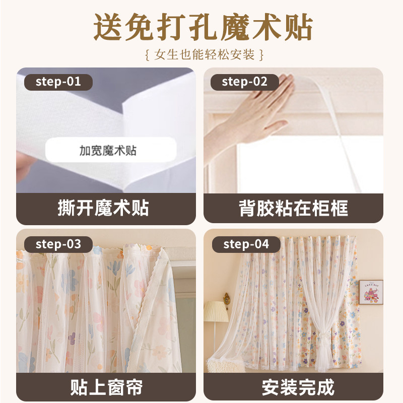 免打孔魔术贴遮光窗帘宿舍护纱帘门帘卧室伸缩杆窗户阳台飘窗粘贴