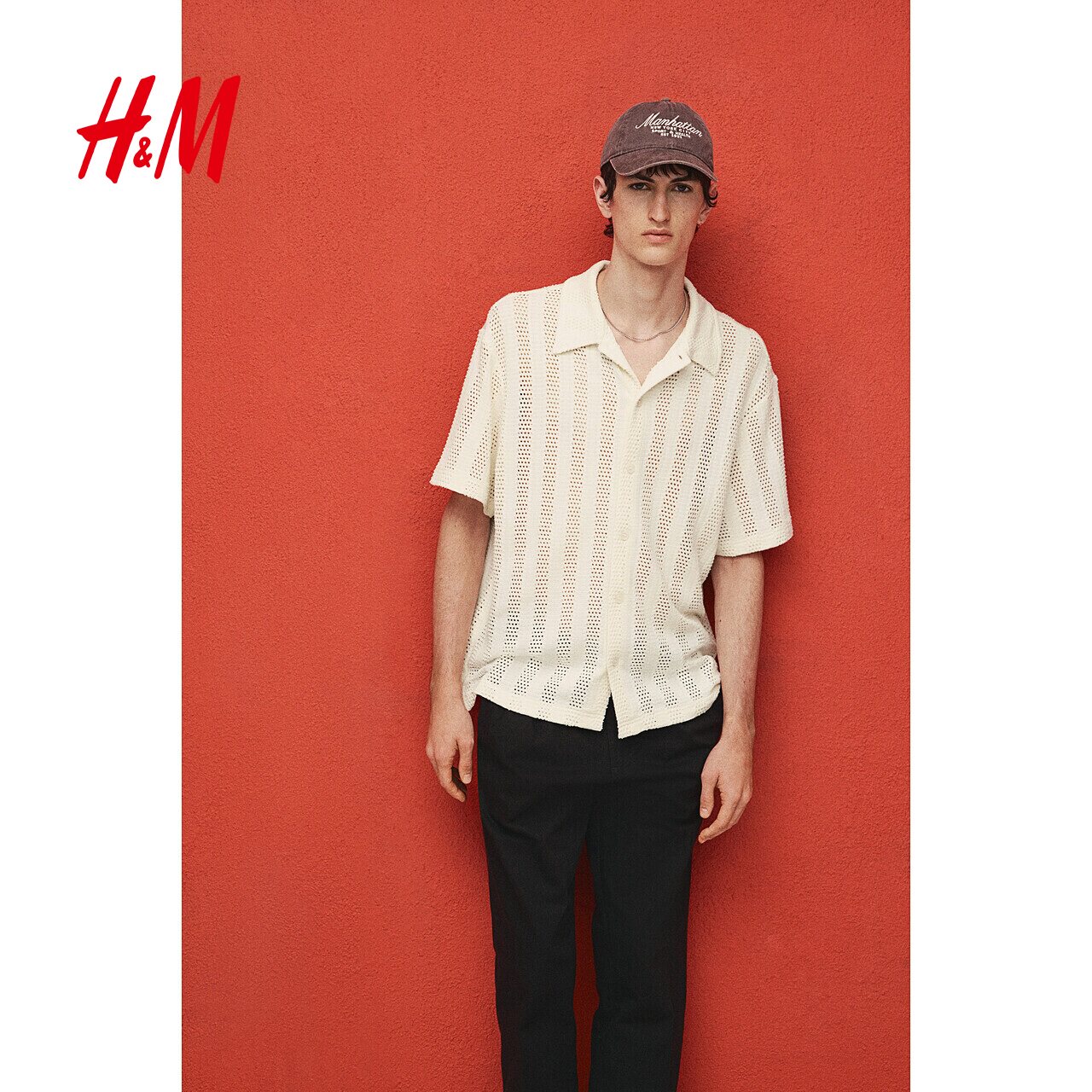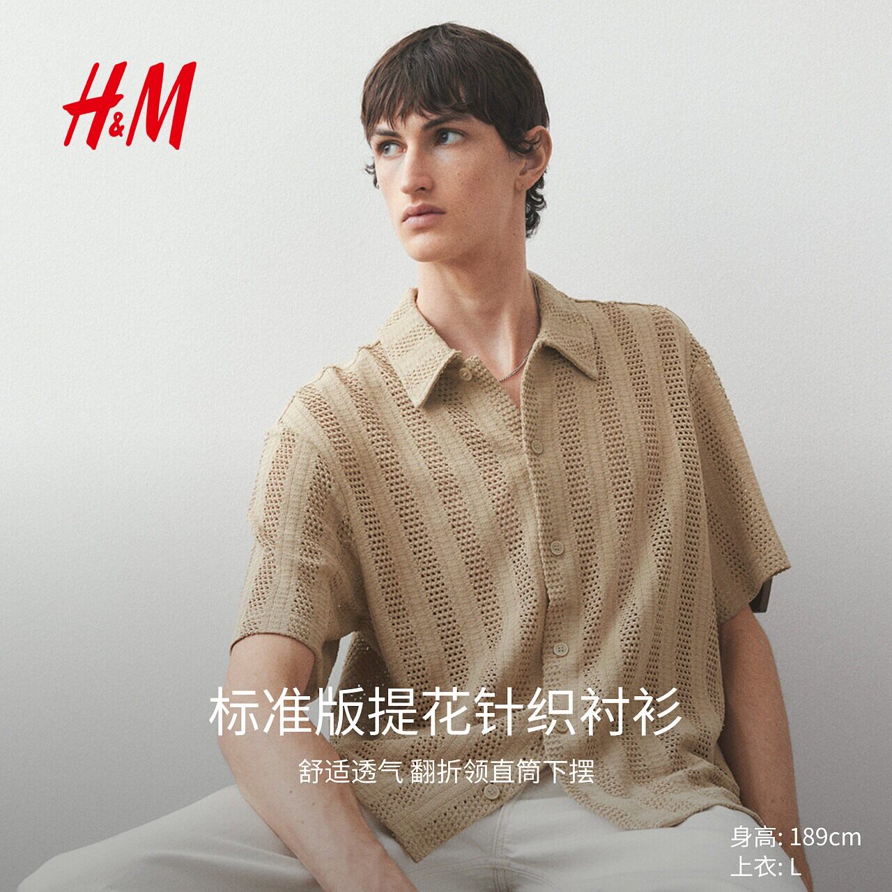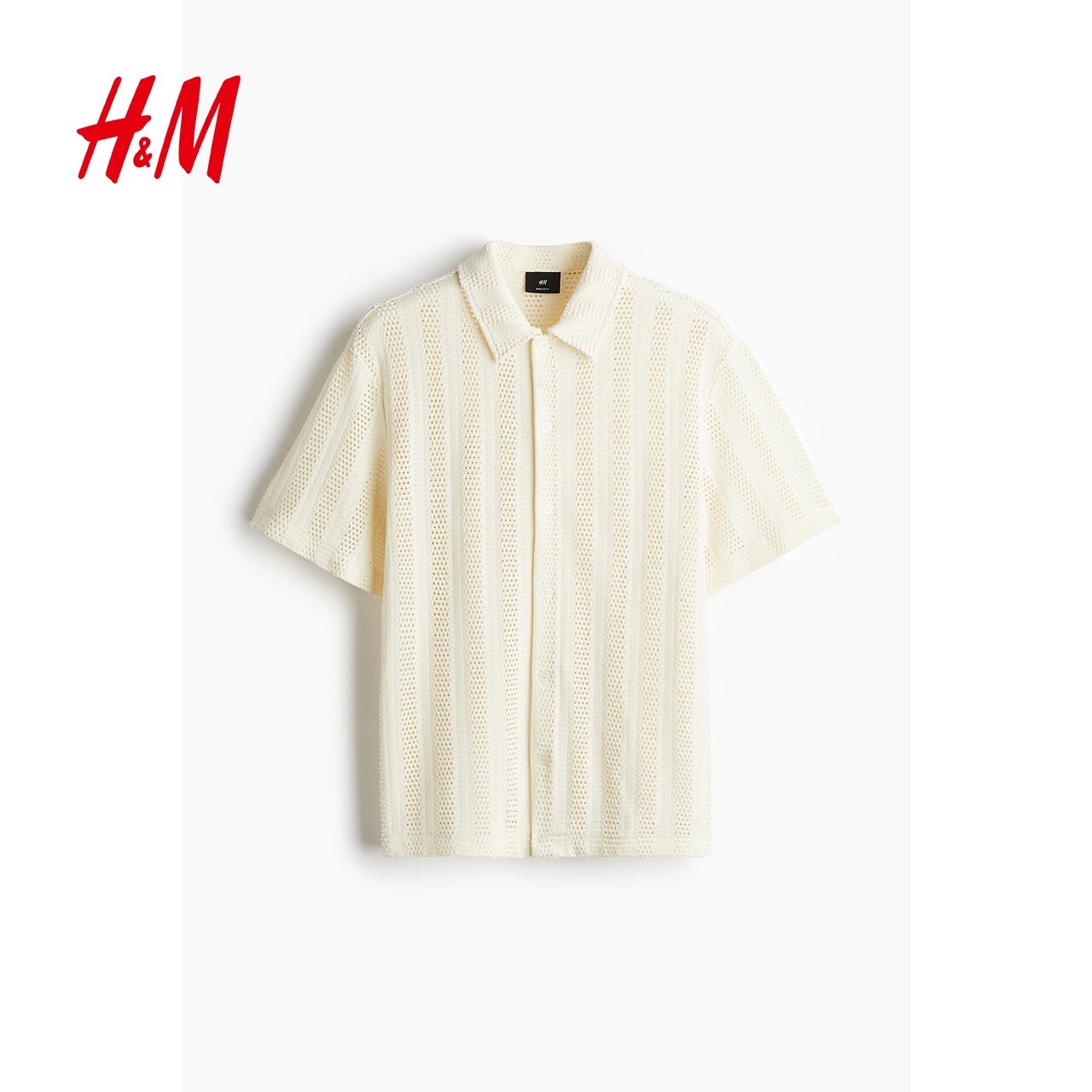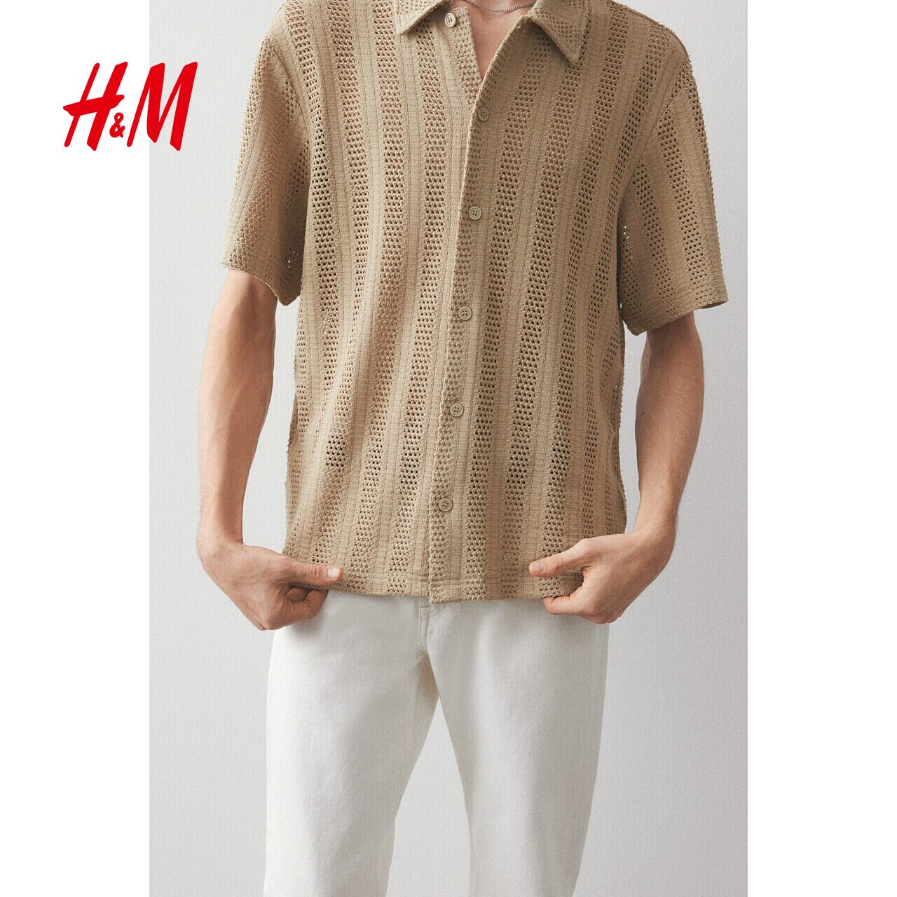 HM男装衬衫春季短袖翻领提花针织直筒下摆上衣1262919