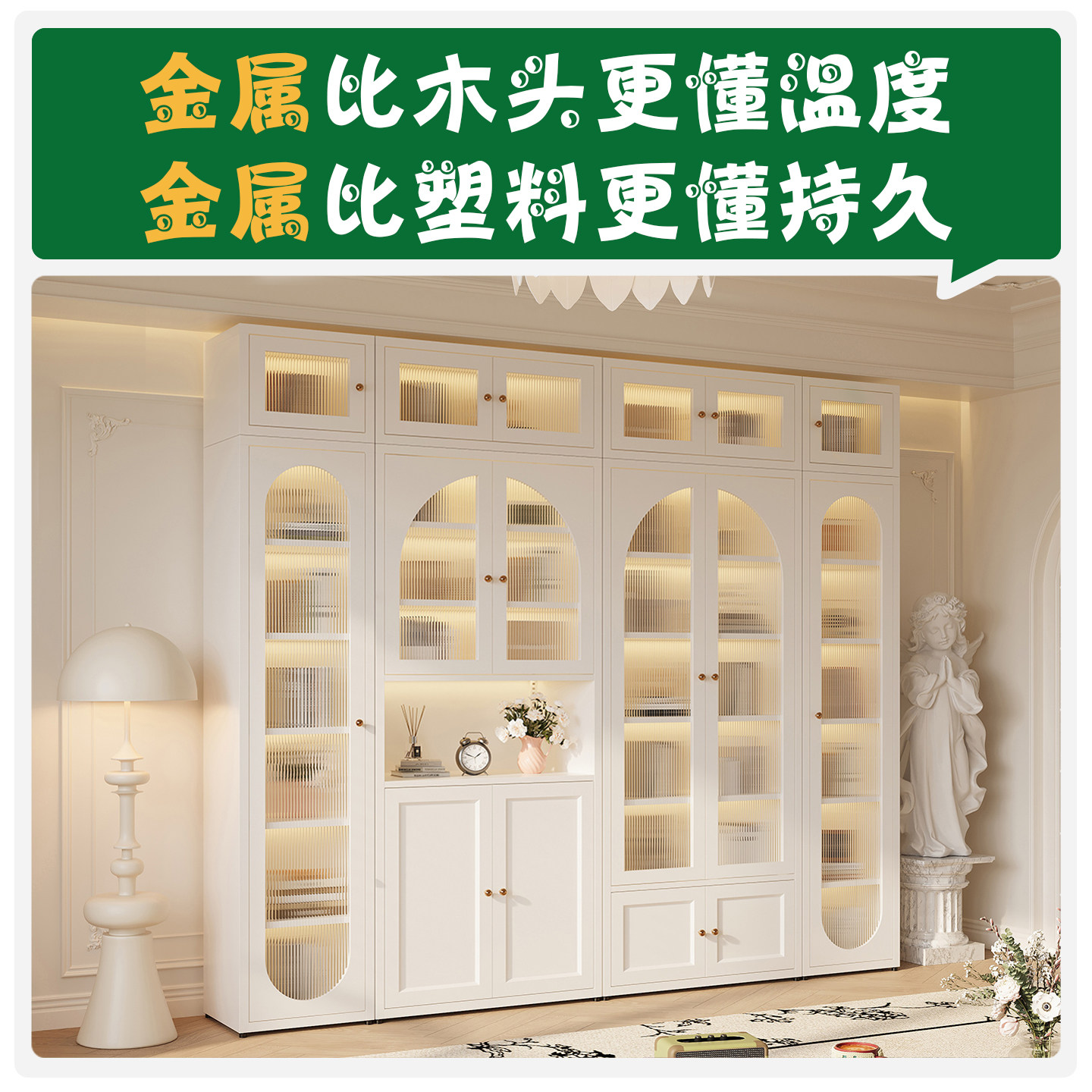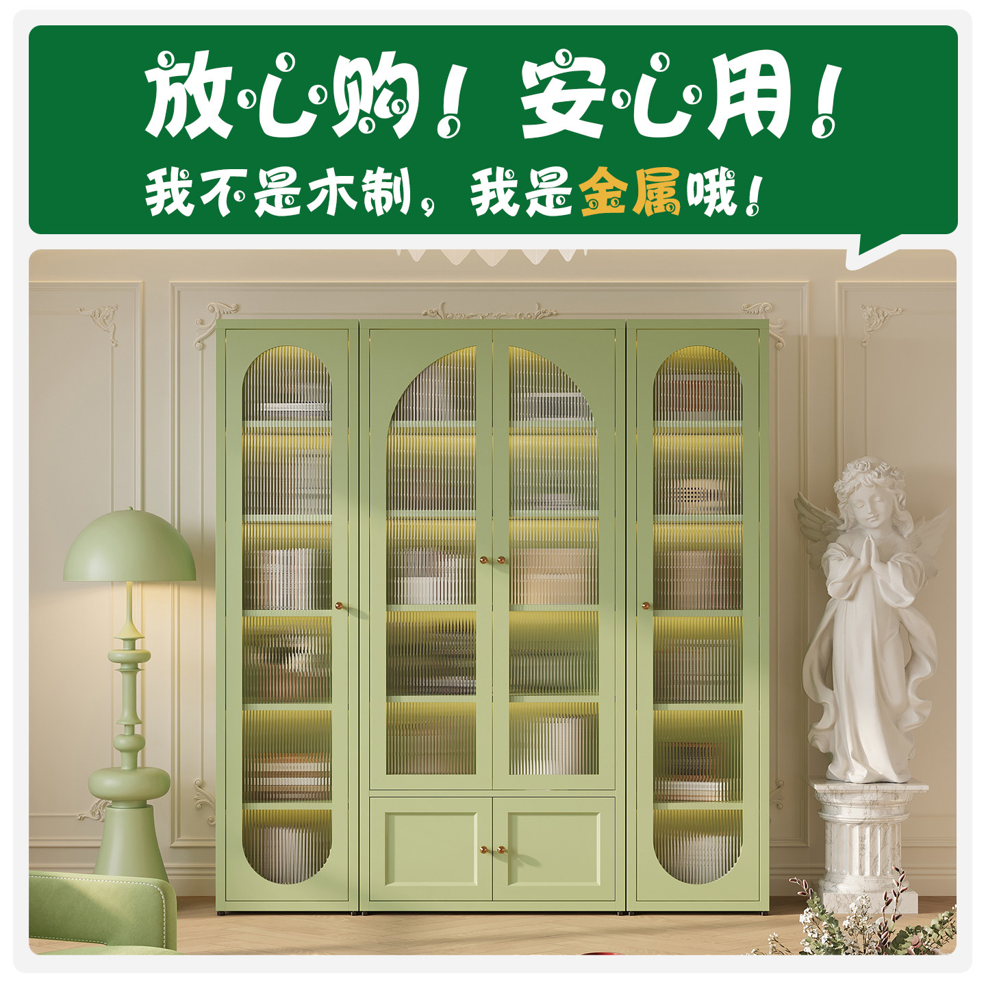 奶油风铁艺书柜玻璃门客厅置物柜简约家用收纳展示柜储物柜落地柜