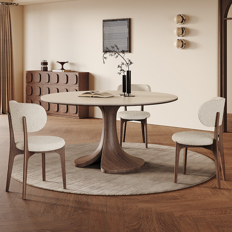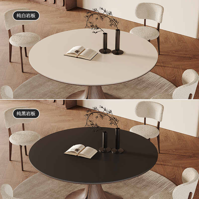 纯白岩板圆餐桌带转盘家用小户型高端复古胡桃色贴皮实木圆餐桌