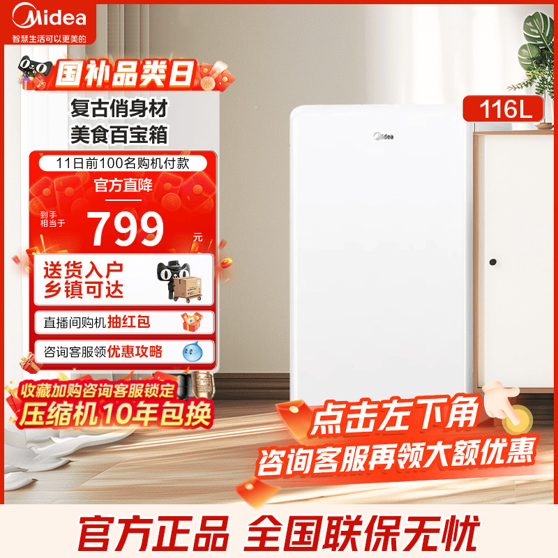 美的116升复古冰箱单门双温冷藏冷冻家用冷藏单门小型租房小冰箱