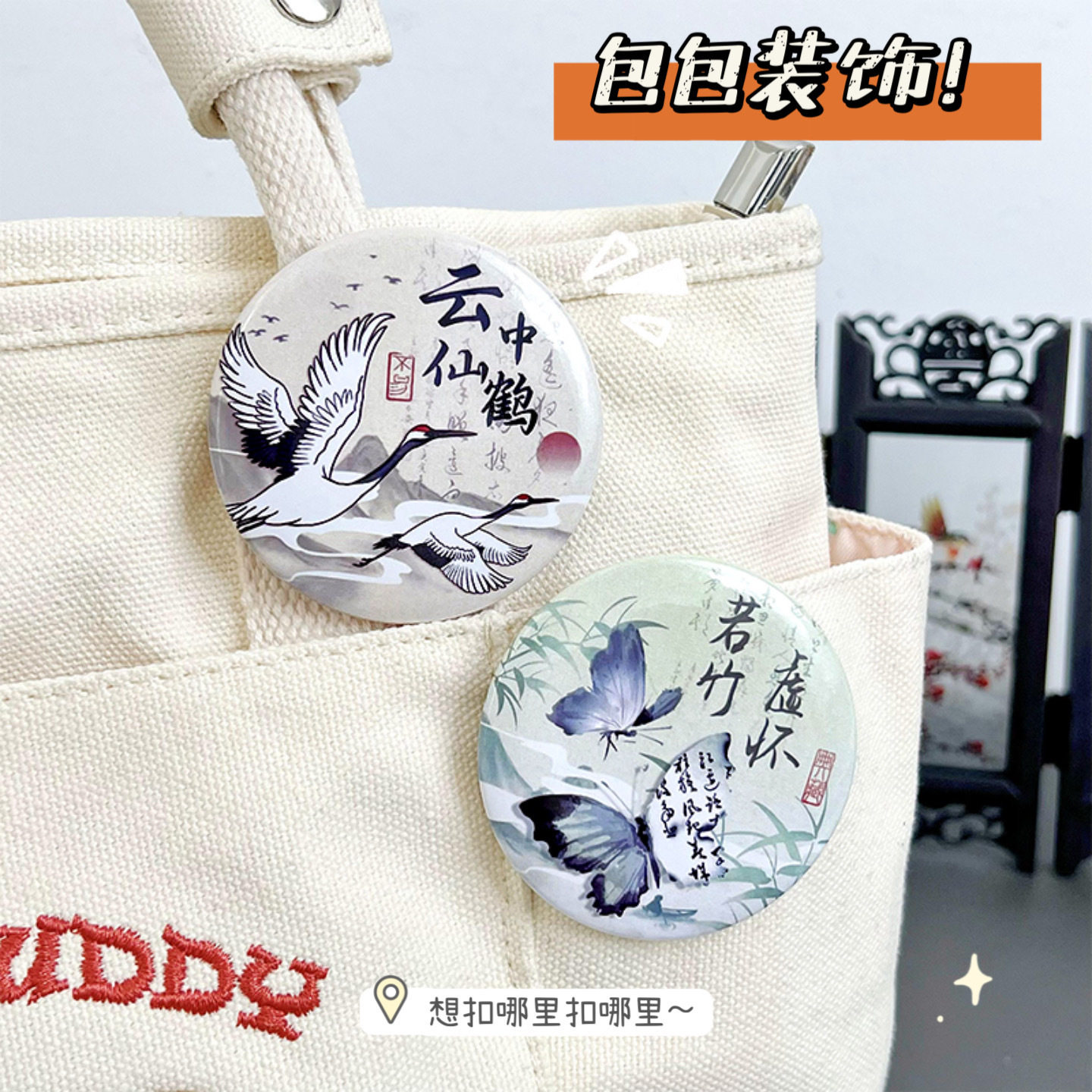 中国风吧唧胸针复古水墨画古诗词马口铁谷子徽章笔袋书包装饰挂件