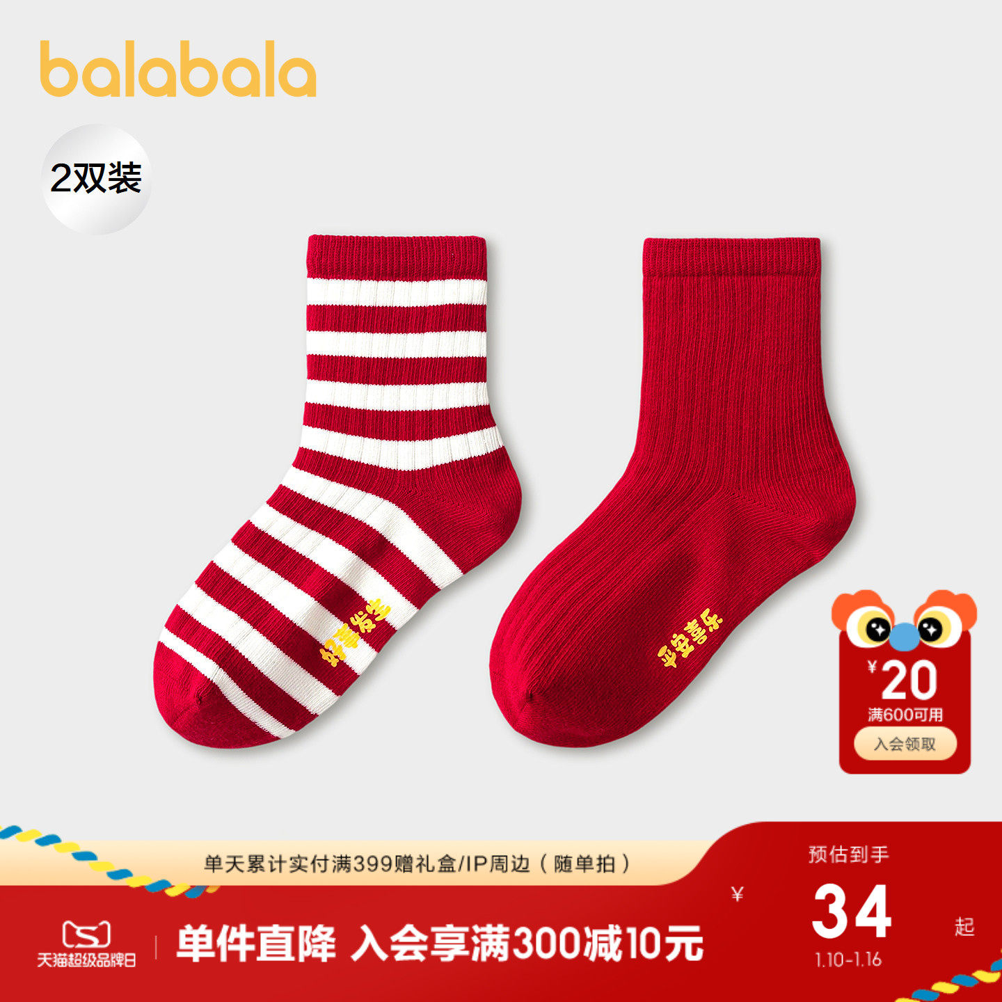 【商场同款】巴拉巴拉儿童袜子春秋男童棉袜中筒袜提花红色拜年服