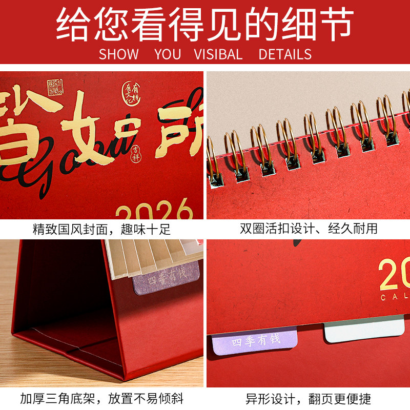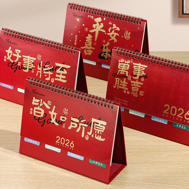 2026年新款趣味文字台历商务办公桌面摆件中国红封面打卡备忘录翻页月历公司企业定制可印logo马年日历本订制