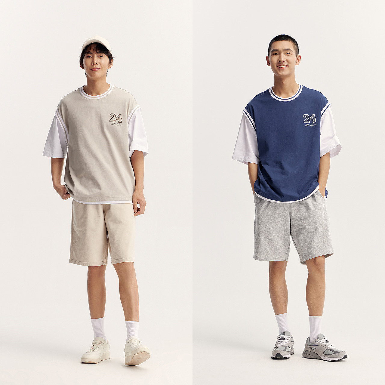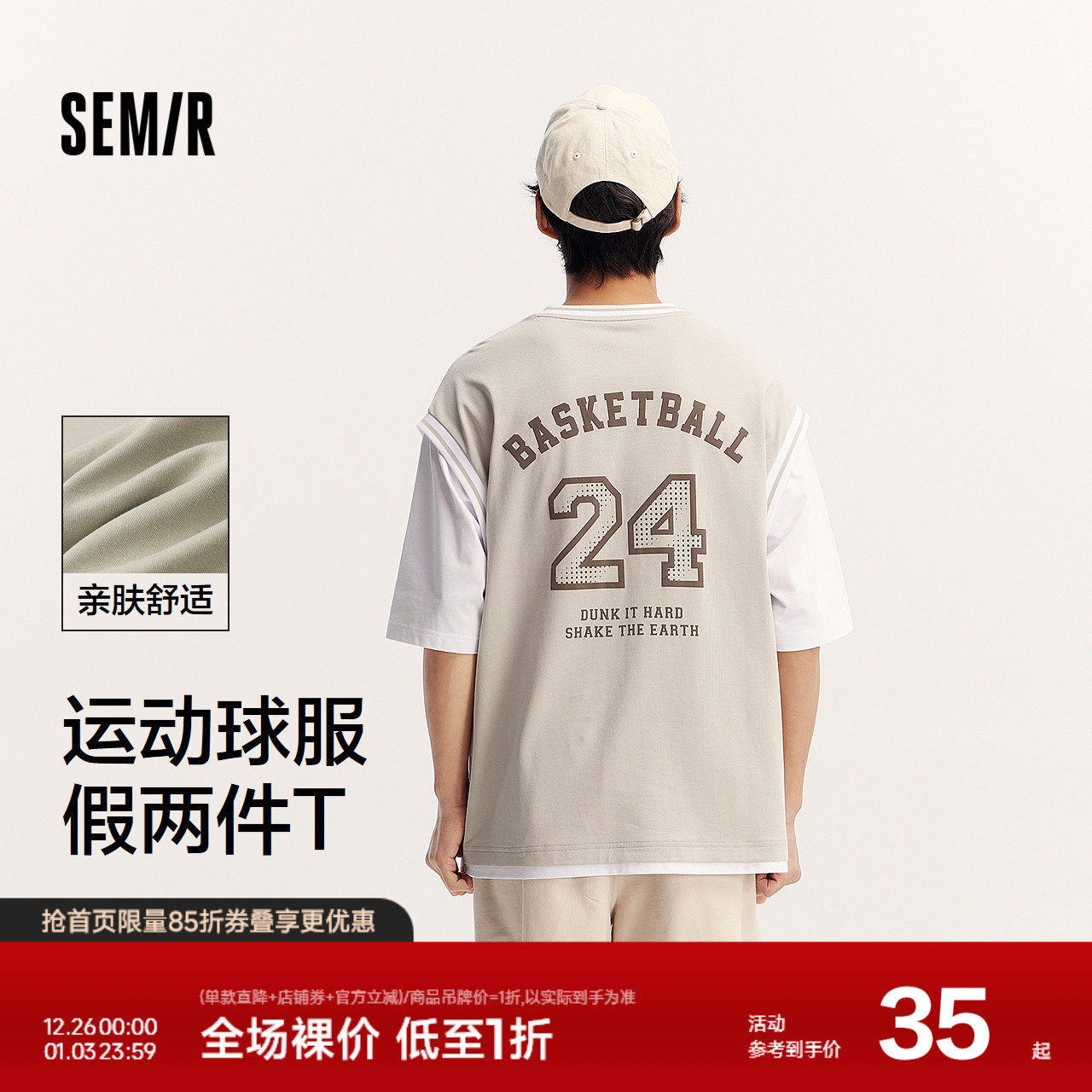 森马短袖T恤男时尚假两件上衣夏季oversize运动球服潮流撞色印花