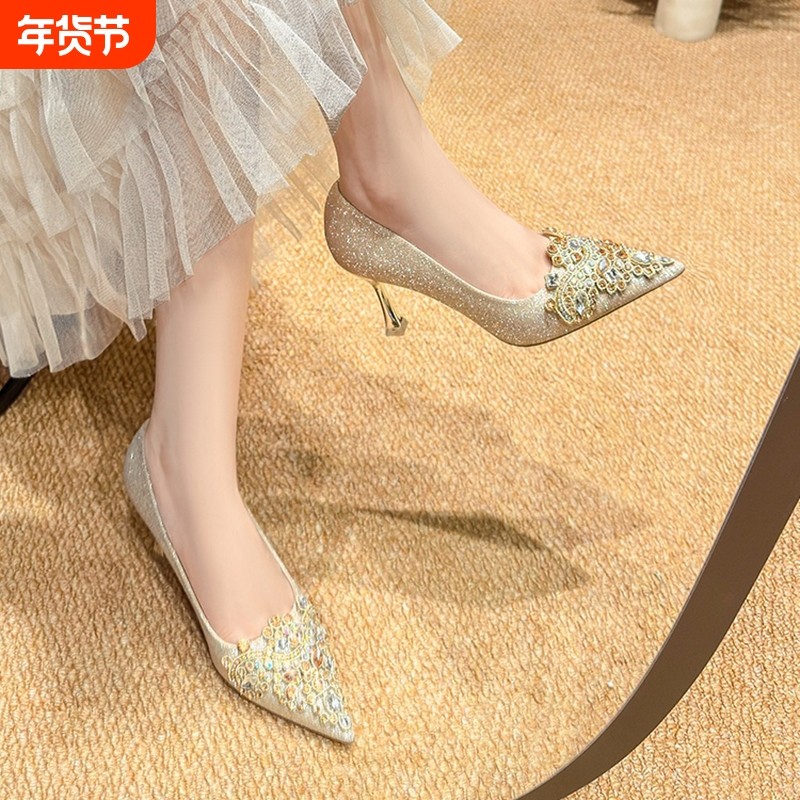 婚鞋女2024年新款主婚纱新娘鞋亮片香槟色水晶鞋尖头细跟高跟鞋女