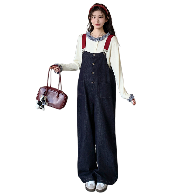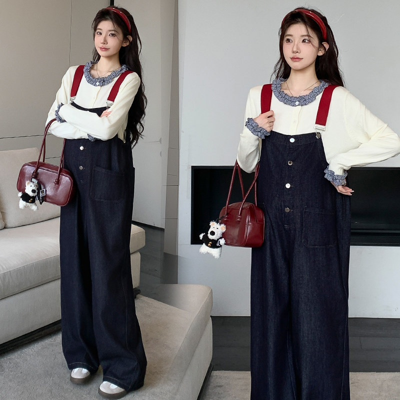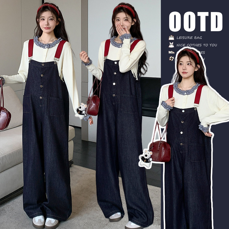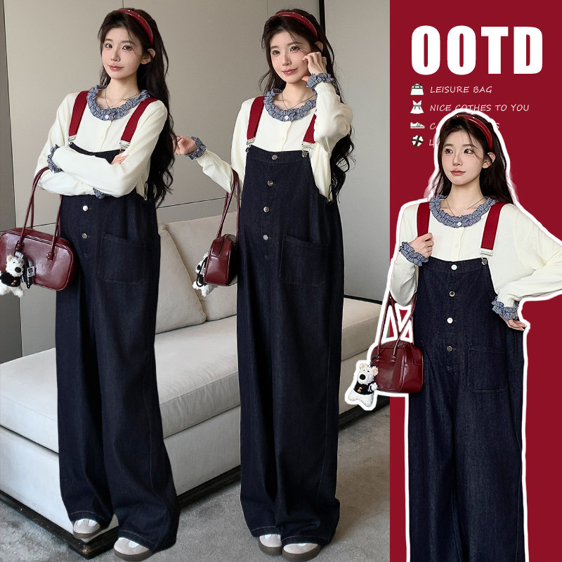 婧麒孕妇装牛仔背带裤套装秋冬2025新款木耳边两件套宽松两件套女