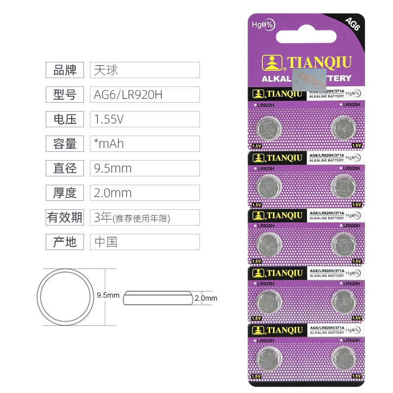 天球AG6纽扣电池LR920H/371A/171手表电池小颗粒通用石英表锂电子