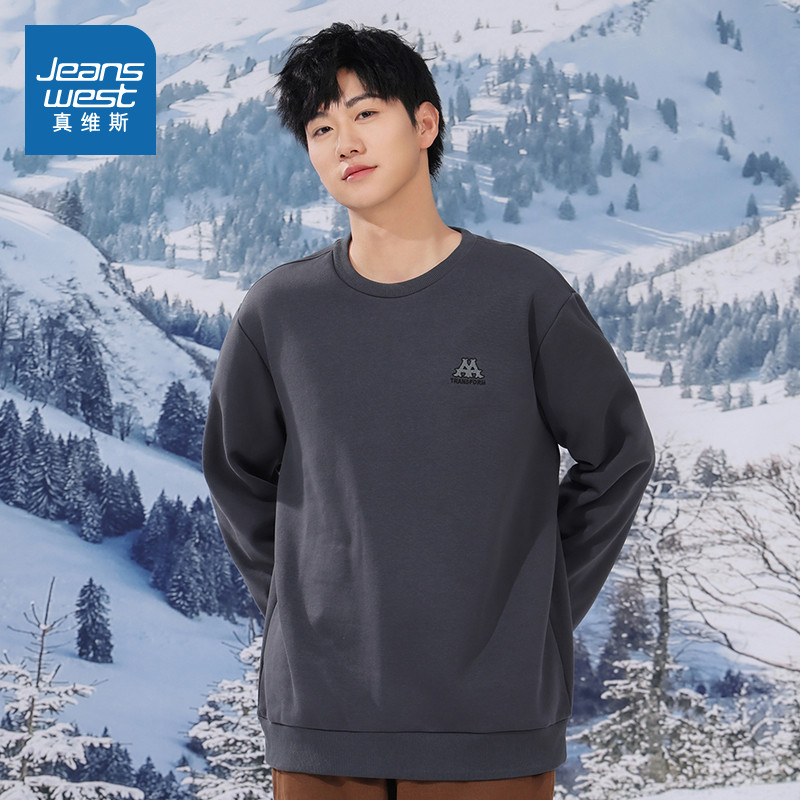 JW真维斯男装加绒卫衣冬季刺绣圆领套头衫学生长袖上衣潮男款衣服