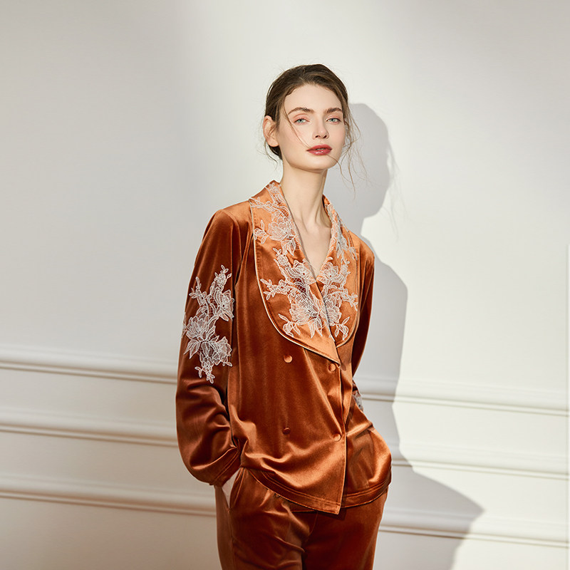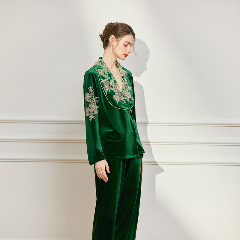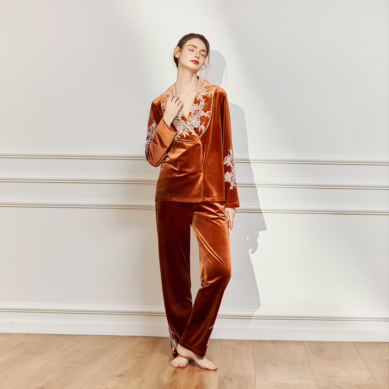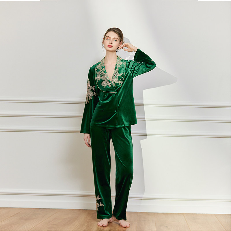 NoirTease春秋加厚金丝绒睡衣女士长袖刺绣高级感家居服两件套装