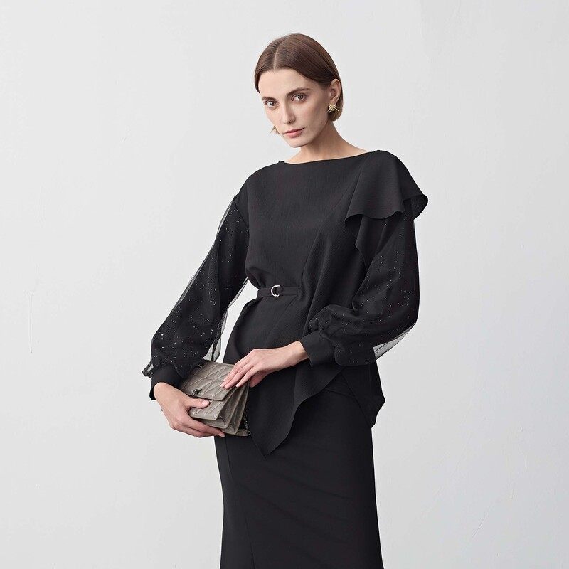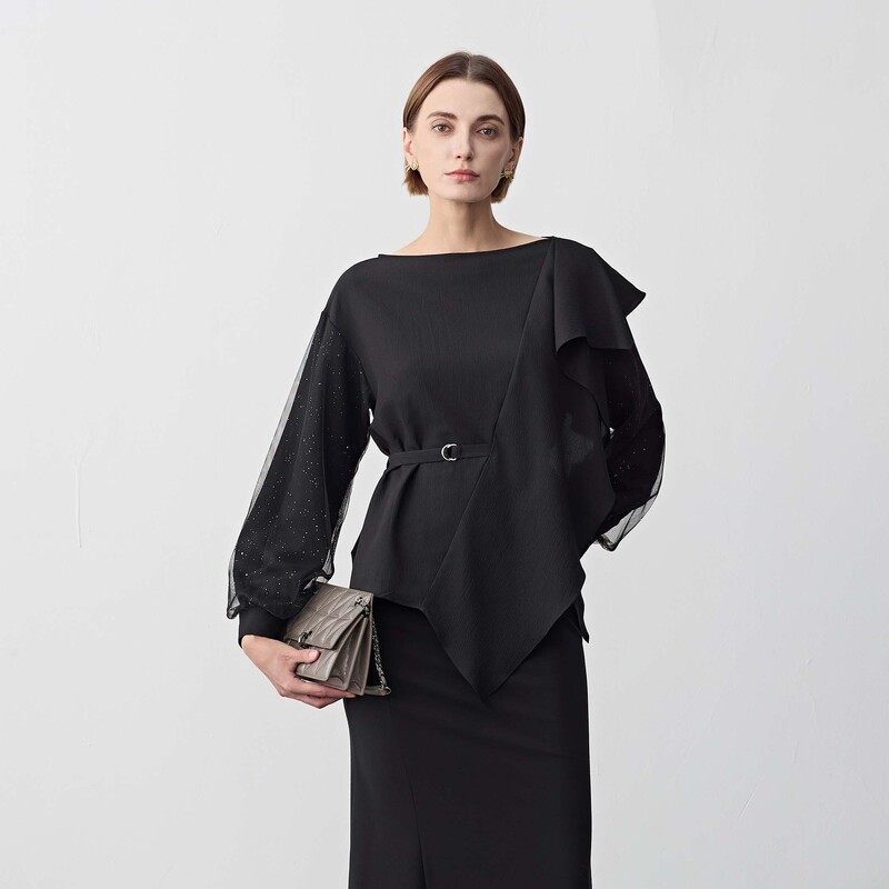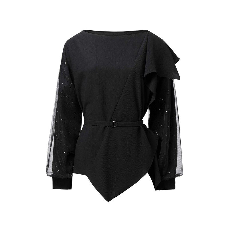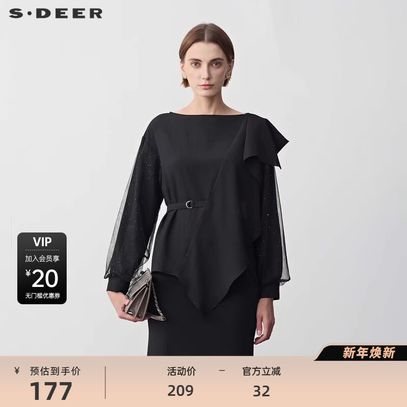 sdeer圣迪奥女装OL风圆领网纱收腰不规则衬衫S243Z0528