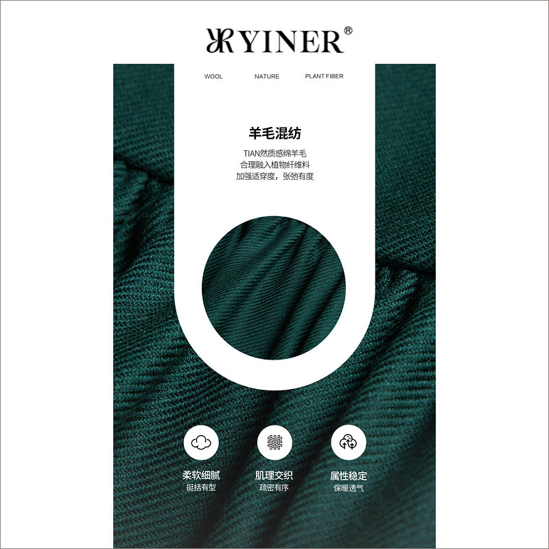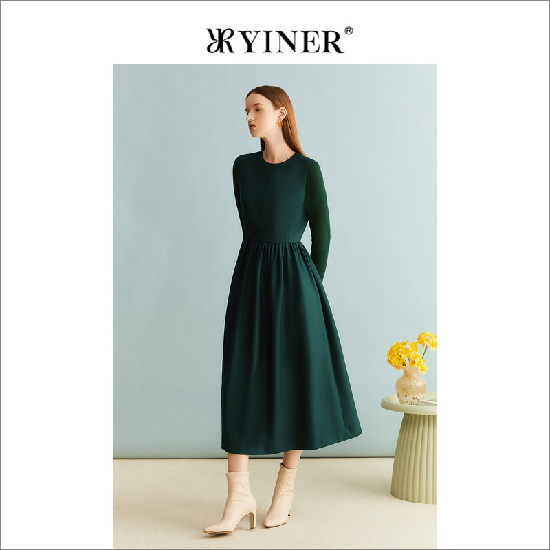 YINER音儿女装冬季法式通勤绵羊毛收腰墨绿色A字连衣裙