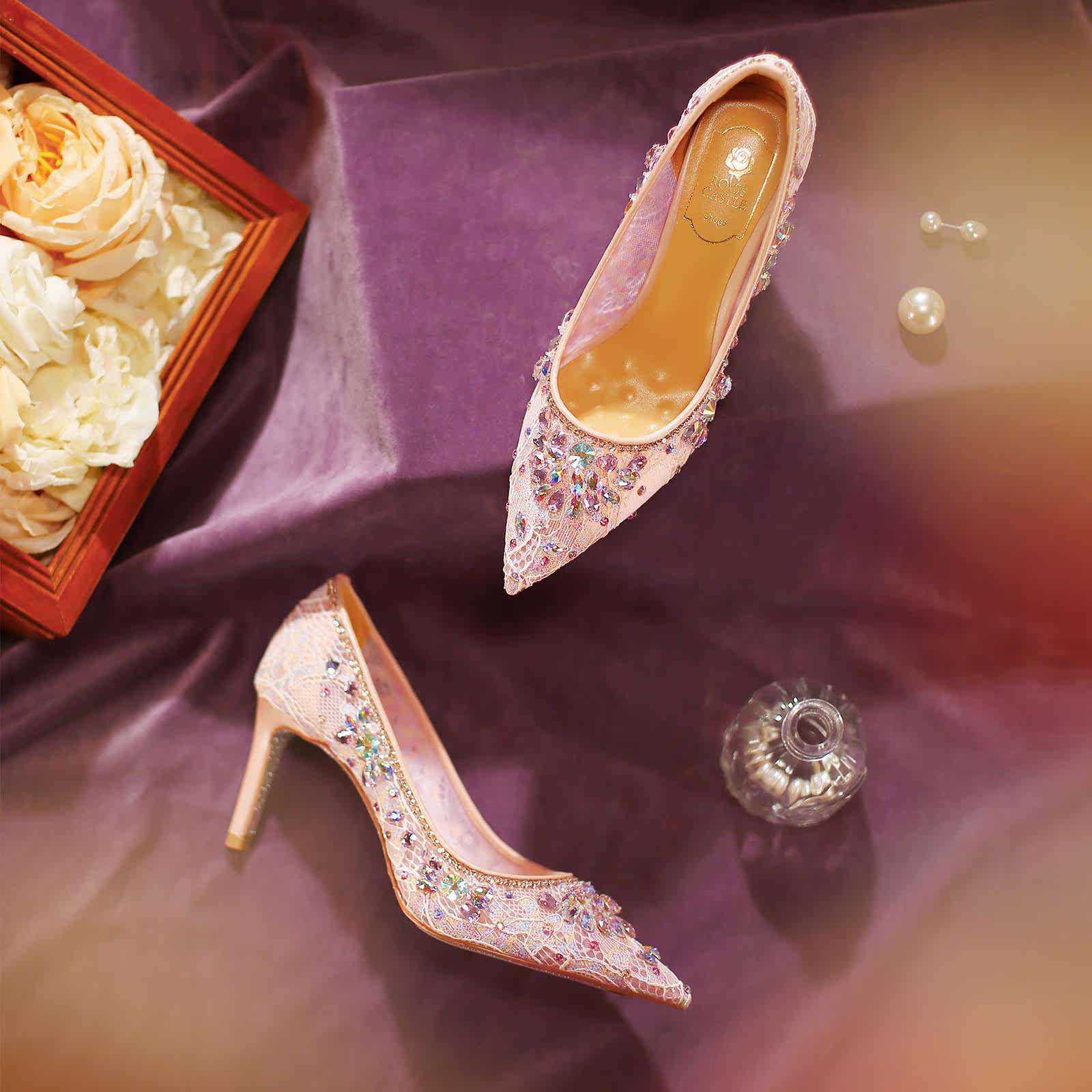 粉霞花漾rose castle婚鞋女轻奢粉色蕾丝水晶高跟鞋主婚纱伴娘鞋