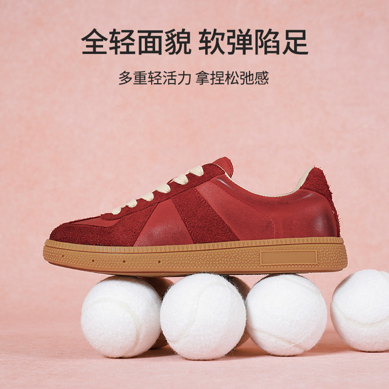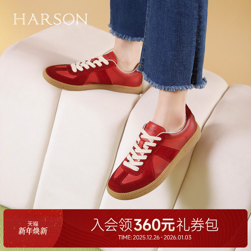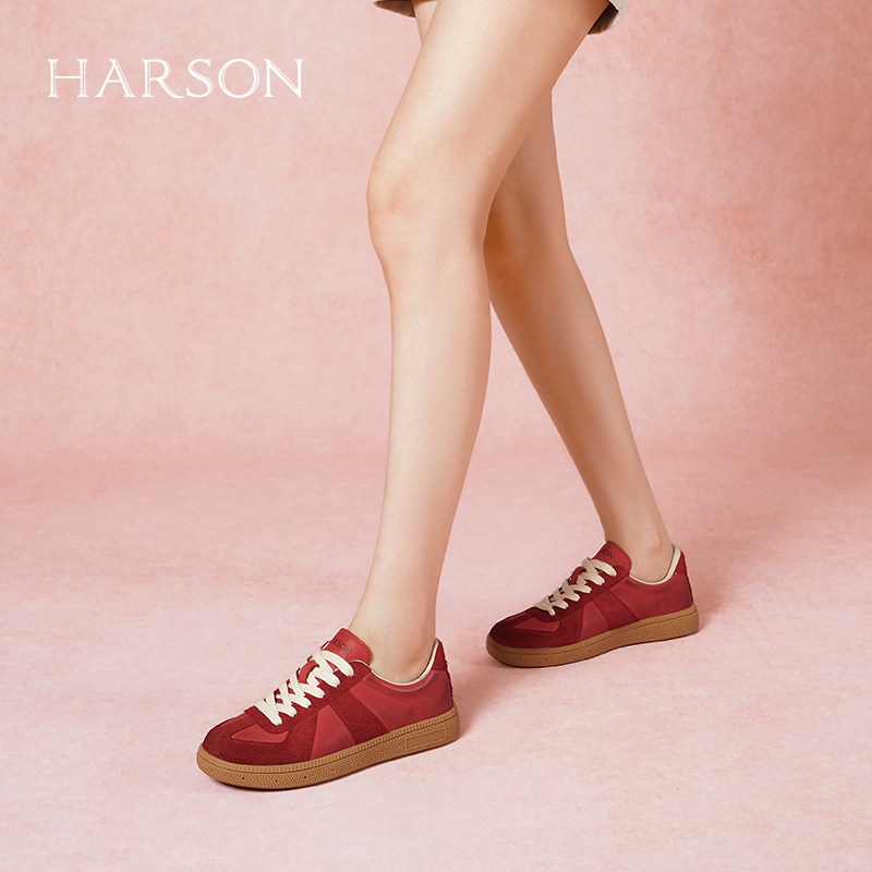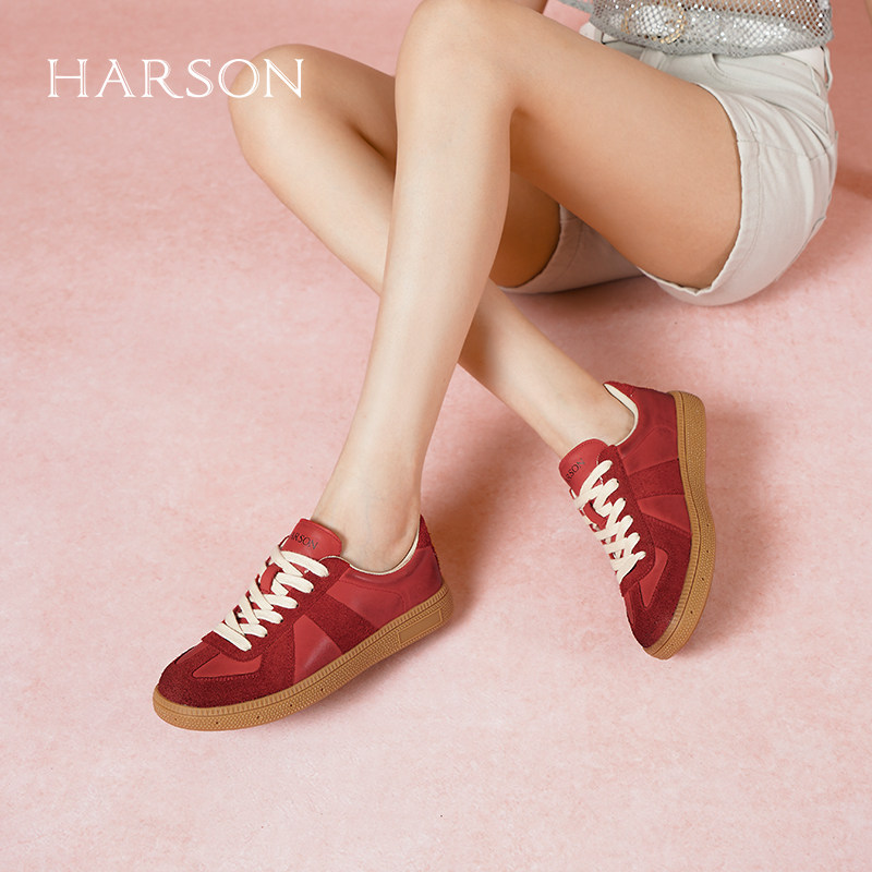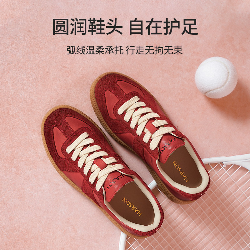 哈森红色德训鞋女秋冬新款复古平底软底休闲运动鞋HWC240107