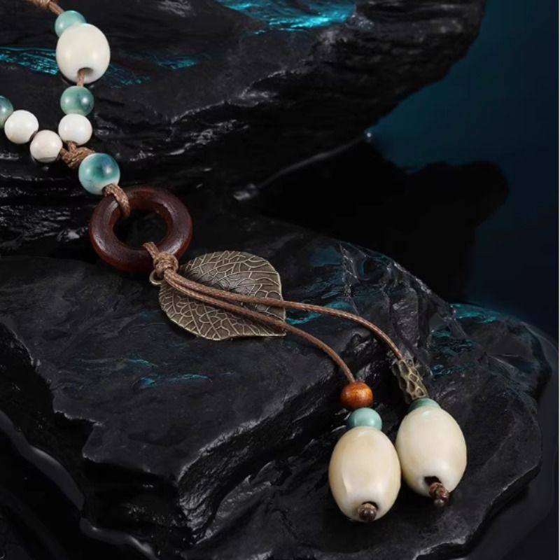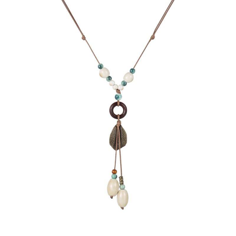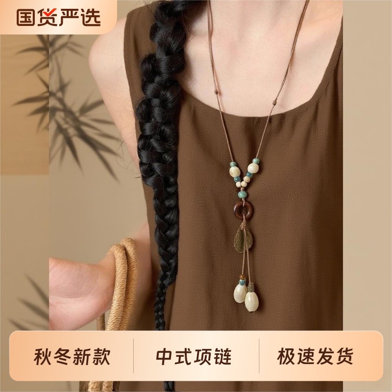 复古树叶流苏长款项链女款吊坠毛衣链民族风陶瓷串珠秋冬配饰新款