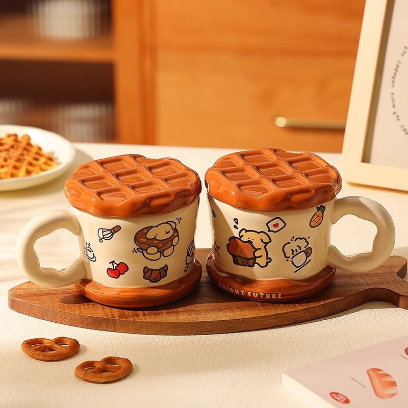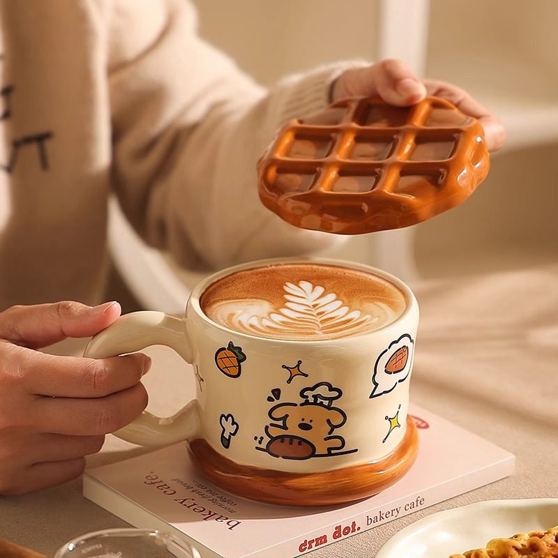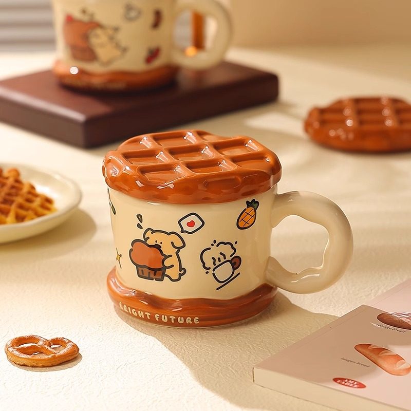 可爱华夫饼马克杯带盖陶瓷杯子生日礼物伴手礼水杯家用高颜值情侣