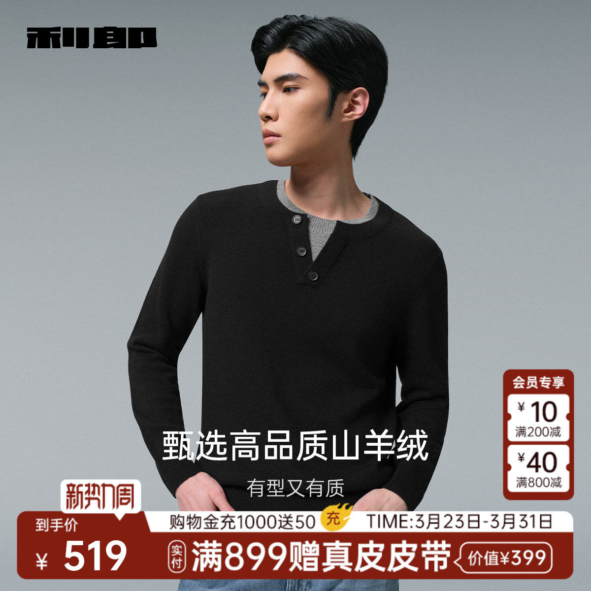 【山羊绒/假两件】利郎官方 毛衫男圆领冬季保暖黑色毛衣男装