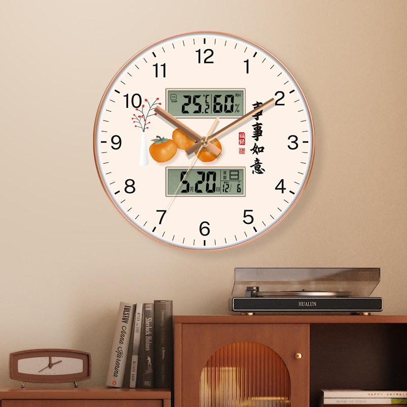 事事如意家用双日历静音挂钟客厅新中式带温湿度电波时钟卧室大气