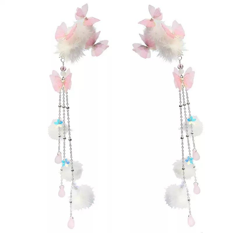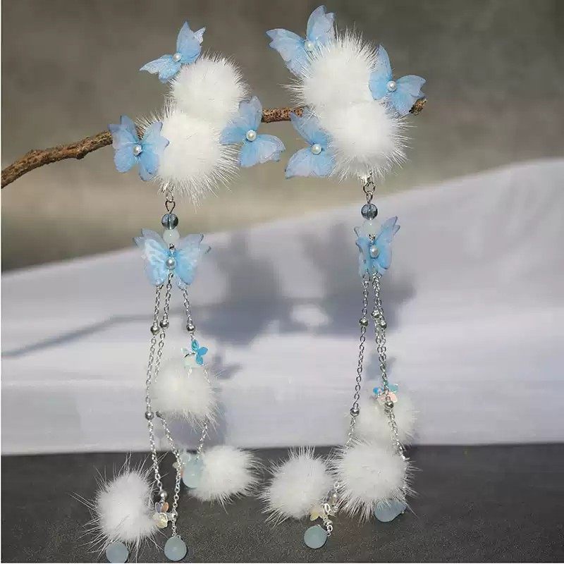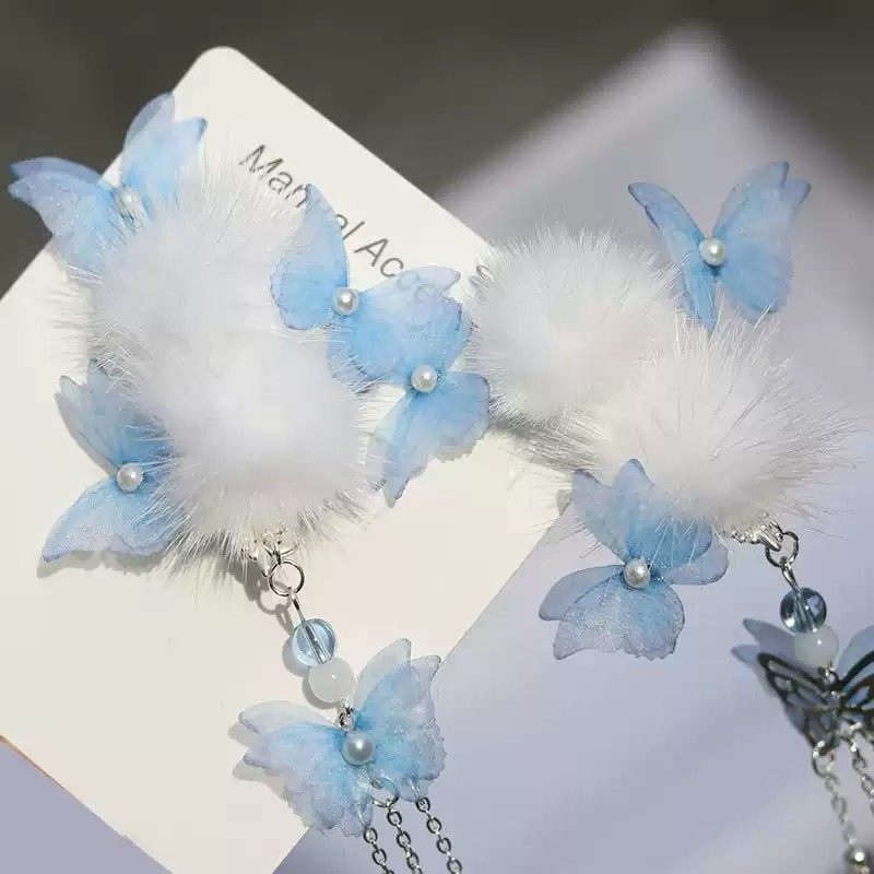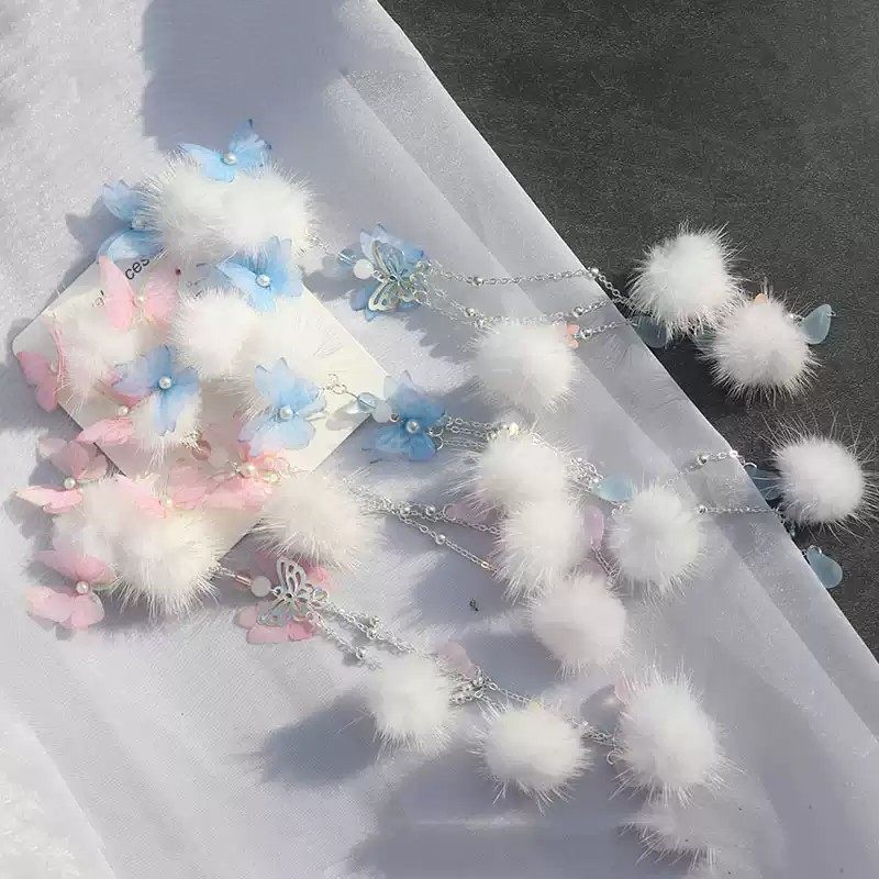 汉服头饰古装流苏毛球发饰古风薄纱蝴蝶超仙貂毛球发卡发夹发簪