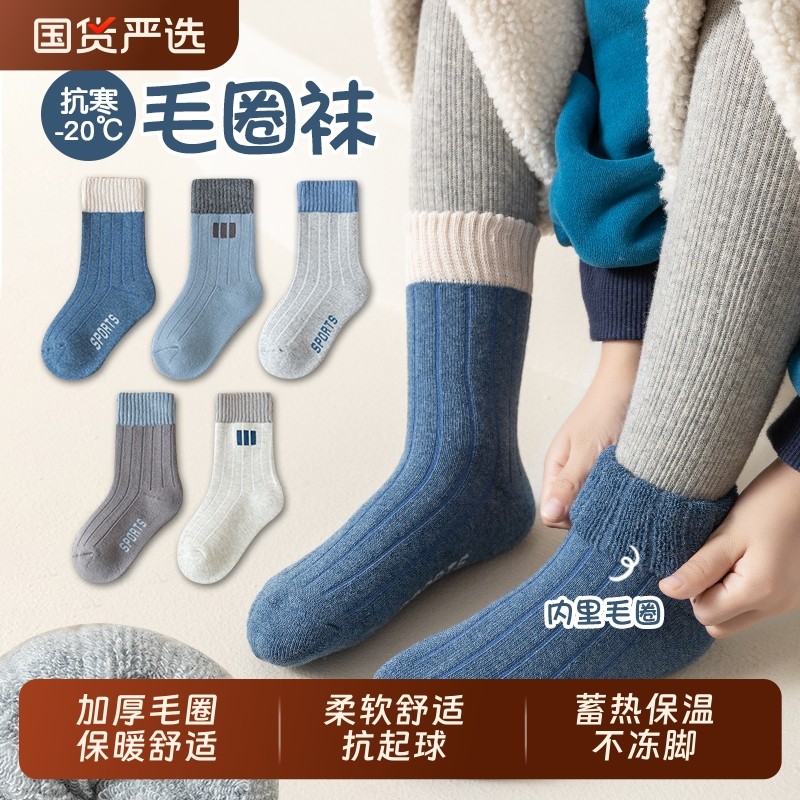 儿童袜子男童加厚秋冬款加绒冬天学生男宝宝中筒冬季毛圈童袜高筒
