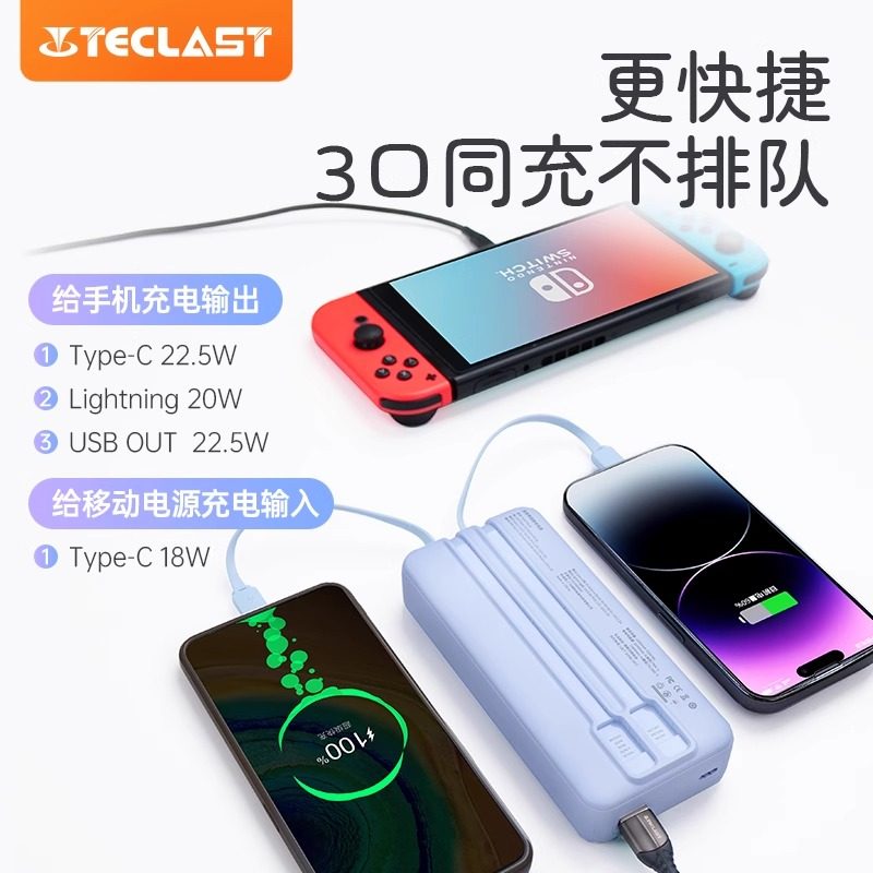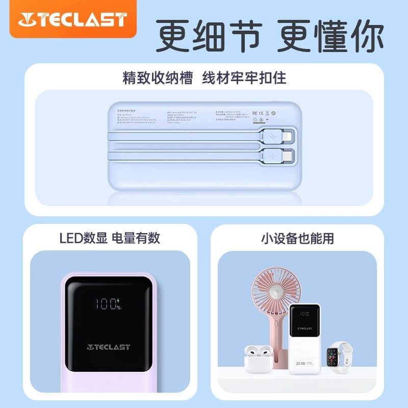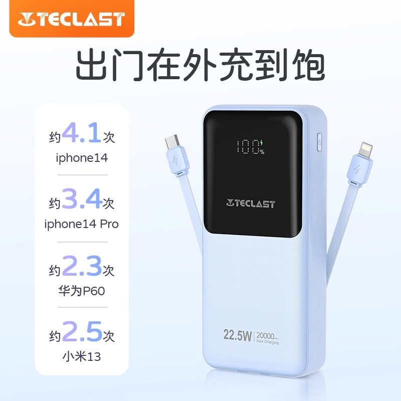 【3C认证】台电2025新款充电宝20000毫安双自带线大容量小巧便捷移动电源22.5w超级双向快充适用苹果安卓手机