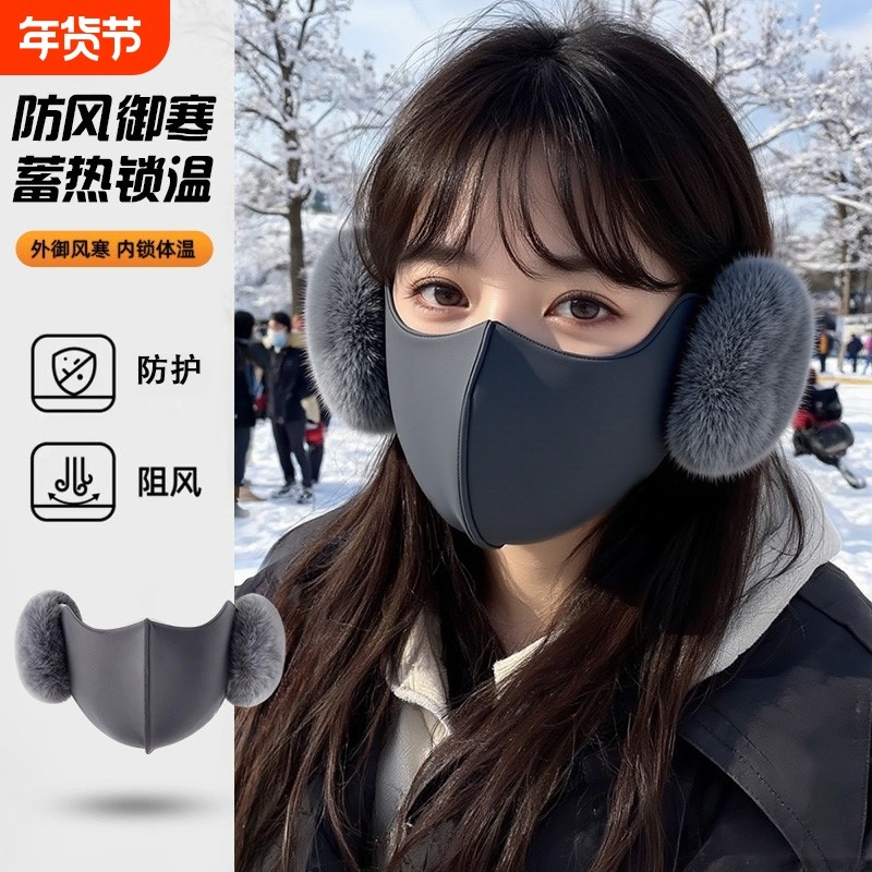 保暖耳罩口罩冬骑行防寒护耳面罩耳套女高颜值加绒抗寒灰色粉色