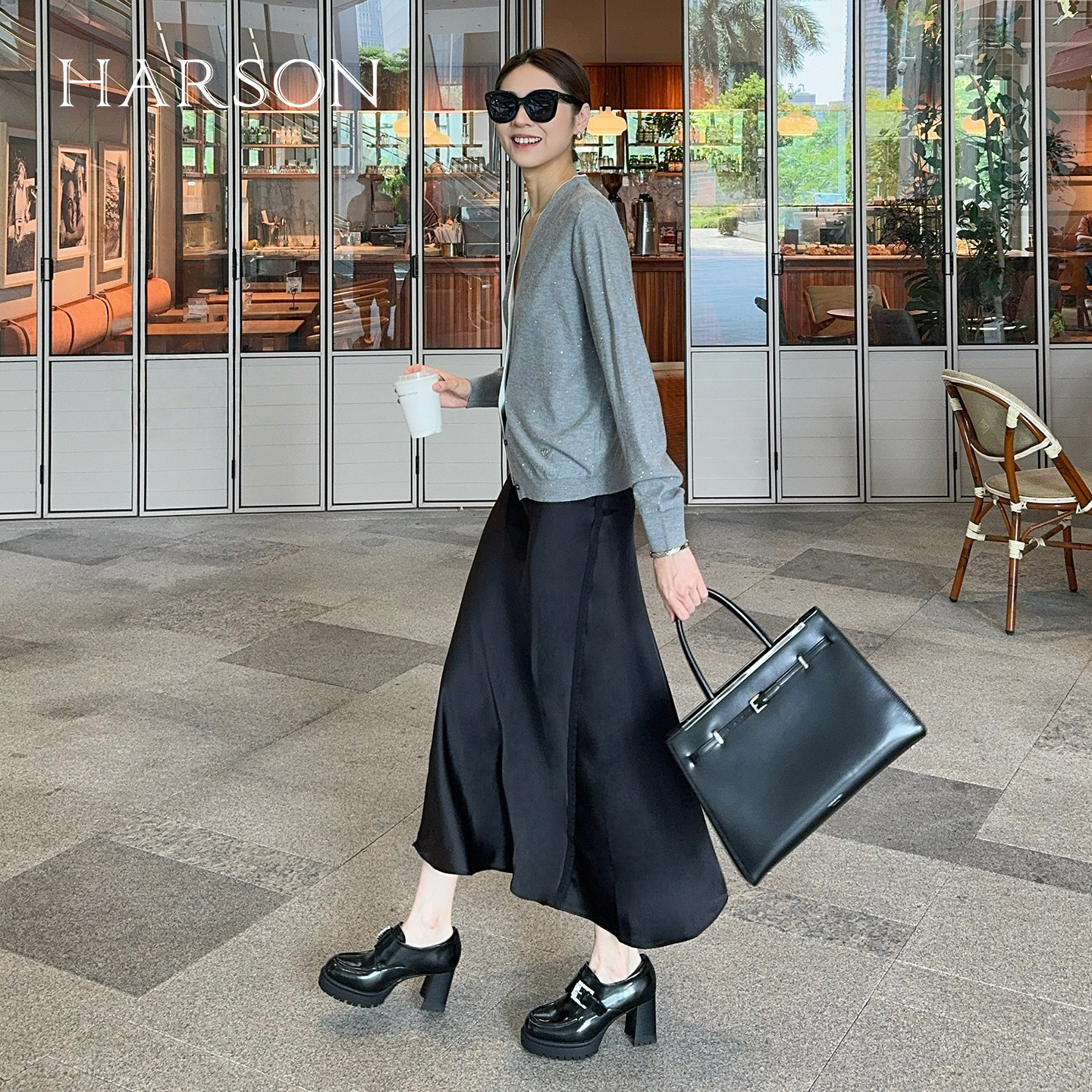 哈森黑色圆头方扣高跟鞋休闲显高时髦乐福鞋皮鞋女2025秋HL257138